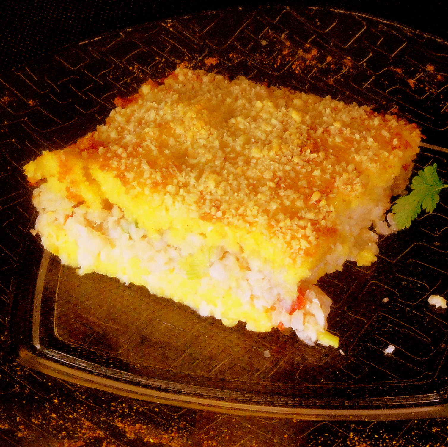 Cortamos la masa de polenta según las dimensiones de la budinera y cubrimos su base previamente enmantecada; distribuimos sobre esta el relleno, cubrimos con la otra capa de polenta, pintamos con manteca y esparcimos por encima queso rallado.
