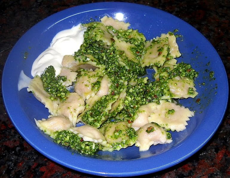 Cocinamos los ravioles en abundante agua con sal (10 g de sal x litro de agua y 1litro de agua x c/100 g de pasta) y una vez al dente escurrimos y volcamos sobre fuente de mesa bien precalentada, echamos por encima el pesto, mezclamos y servimos de inmediato. Podemos agregar al plato una cucharada de crema.