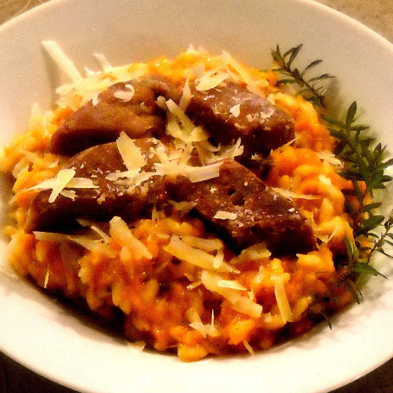 Hacia el final de la cocción añadimos el resto de la manteca, el parmesano rallado (reservamos un poco), el puré de calabazas y la mitad de los trozos de seitán; mezclamos hasta que el líquido se haya absorbido casi por completo, apagamos el fuego y dejamos tapado el recipiente por unos 5′ antes de servir.