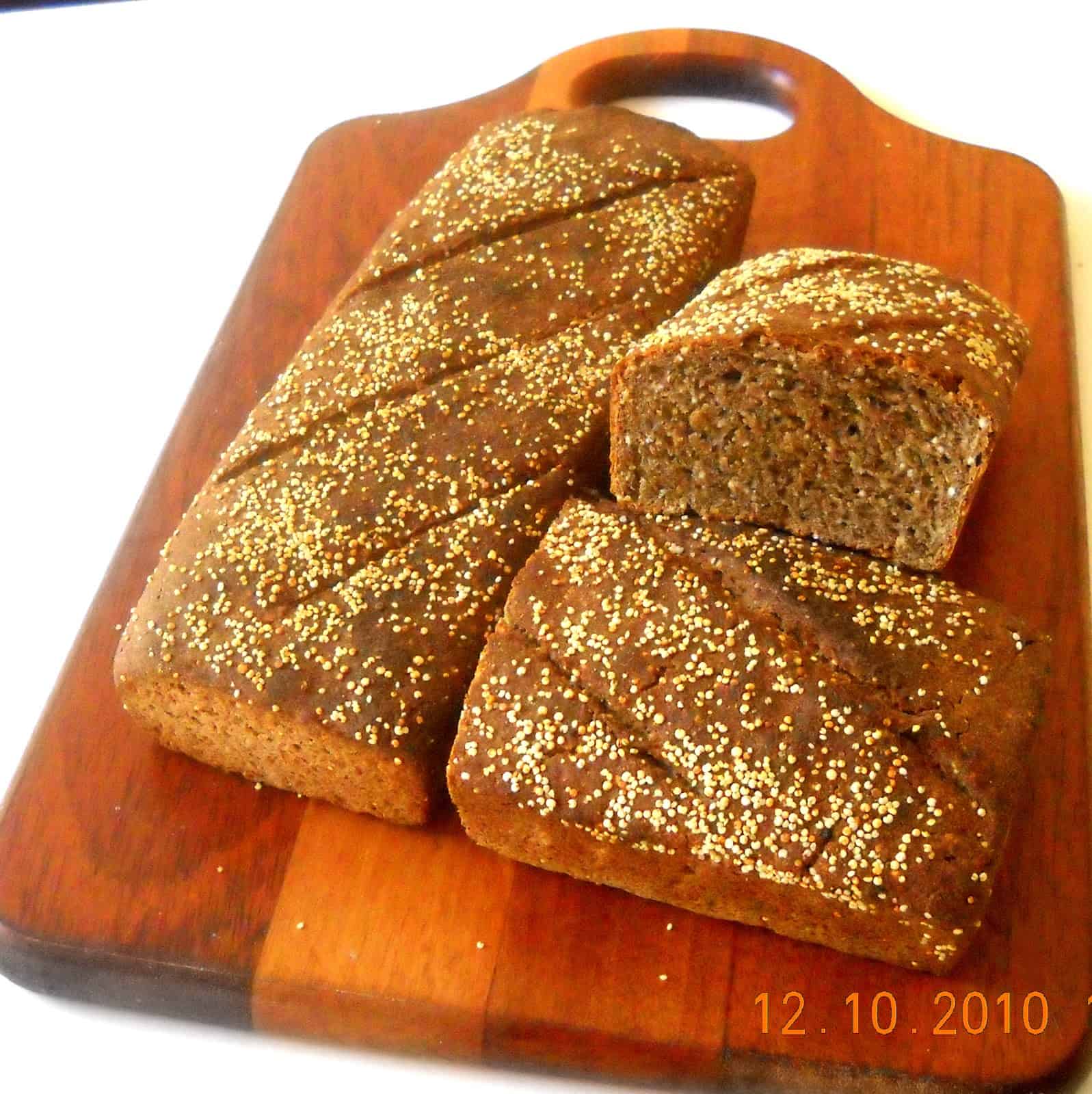 Encendemos el horno. Volcamos el bollo sobre superficie de trabajo apenas enharinada, lo dividimos en 2 y luego de unos minutos de reposo damos forma empleando una técnica similar a la de las baguettes (ver: “Baguettes Caseras, Técnicas Básicas“) y colocamos en los moldes previamente engrasados; pintamos con huevo o manteca echamos por encima las semillas de quinoa que dejamos sin tostar, efectuamos los cortes, cubrimos con una tela plástica y dejamos levar sobre el horno por otros 45′.