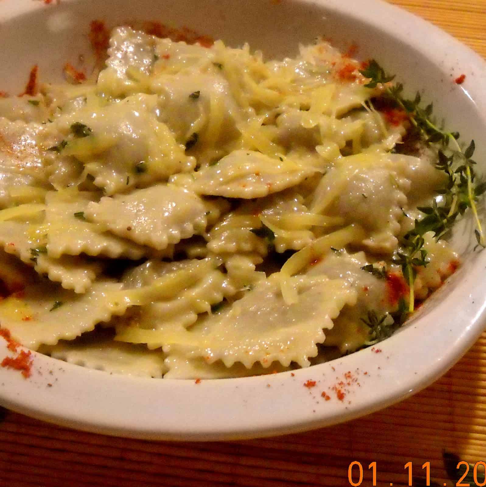 Ponemos a hervir los ravioles en abundante agua con sal mientras que en una sartén grande derretimos la manteca, le agregamos las hojas de tomillo, salpimenamos y mantenemos a fuego corona. Cuando la pasta está al dente la incorporamos a la sartén no del todo escurrida, mezclamos y emplatamos esparciendo por encima queso parmesano recién rallado y hojitas de tomillo.