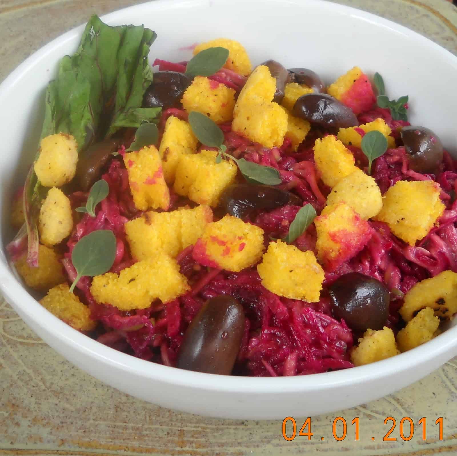 Otra ensalada veraniega, un poco rara pero rica, colorida y nutritiva, una comida en sí misma. Las remolachas y los zapallitos están muy tiernos y baratos en este época en Argentina, buena razón para disfrutarlos…Para 2 personas: