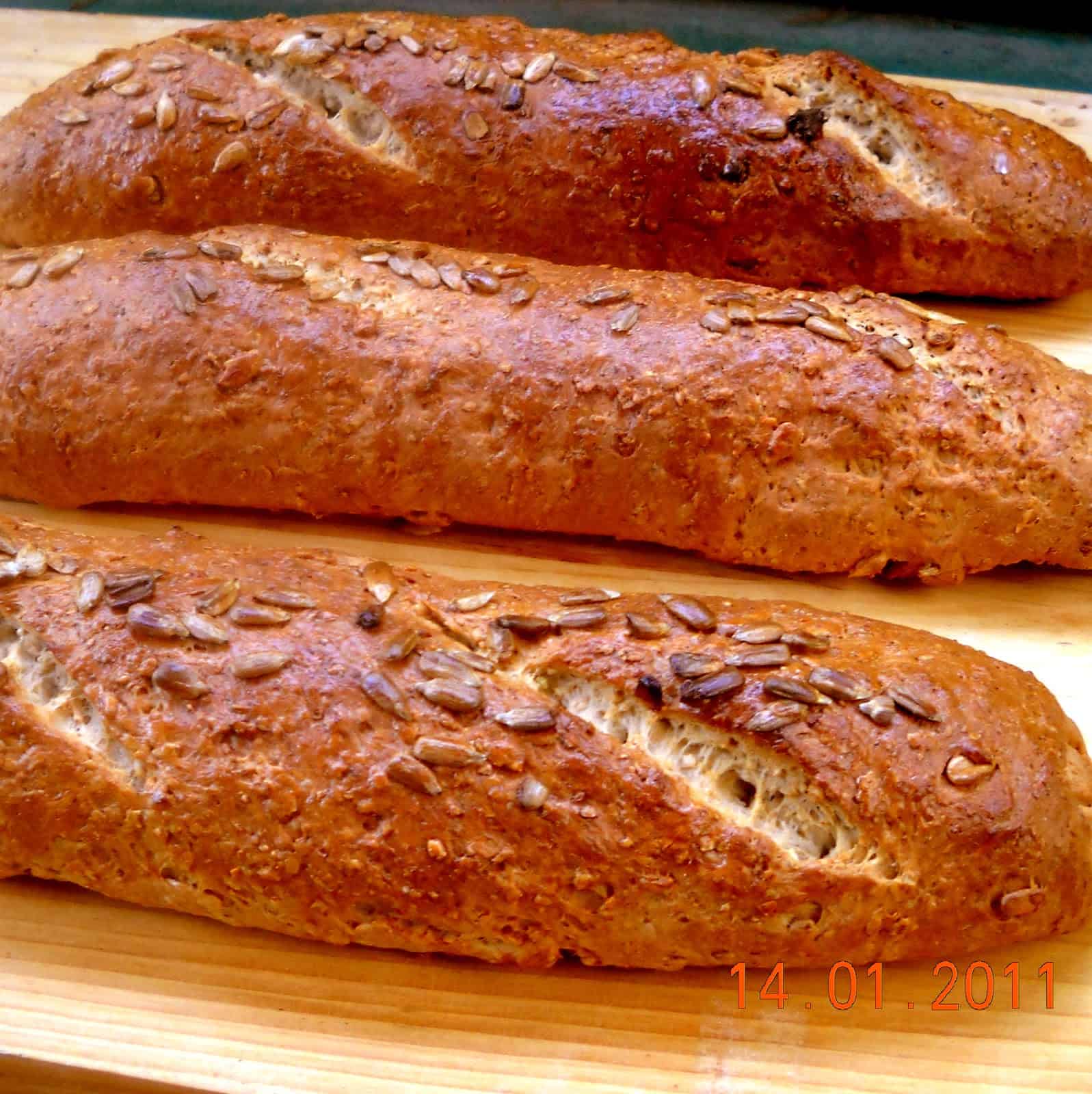 Encendemos el horno. Volcamos la masa sobre la superficie de trabajo apenas enharinada, desgasificamos, dividimos en 3 partes iguales, bollamos, cubrimos con repasador y dejamos descansar unos minutos. Damos forma a los panes (ver por ejemplo Baguettes Caseras, Técnicas Básicas), colocamos sobre una asadera ligeramente engrasada, pintamos con huevo, efectuamos 2 ó 3 cortes, cubrimos y dejamos levar por otros 30′ en ambiente cálido y sin corriente de aire.