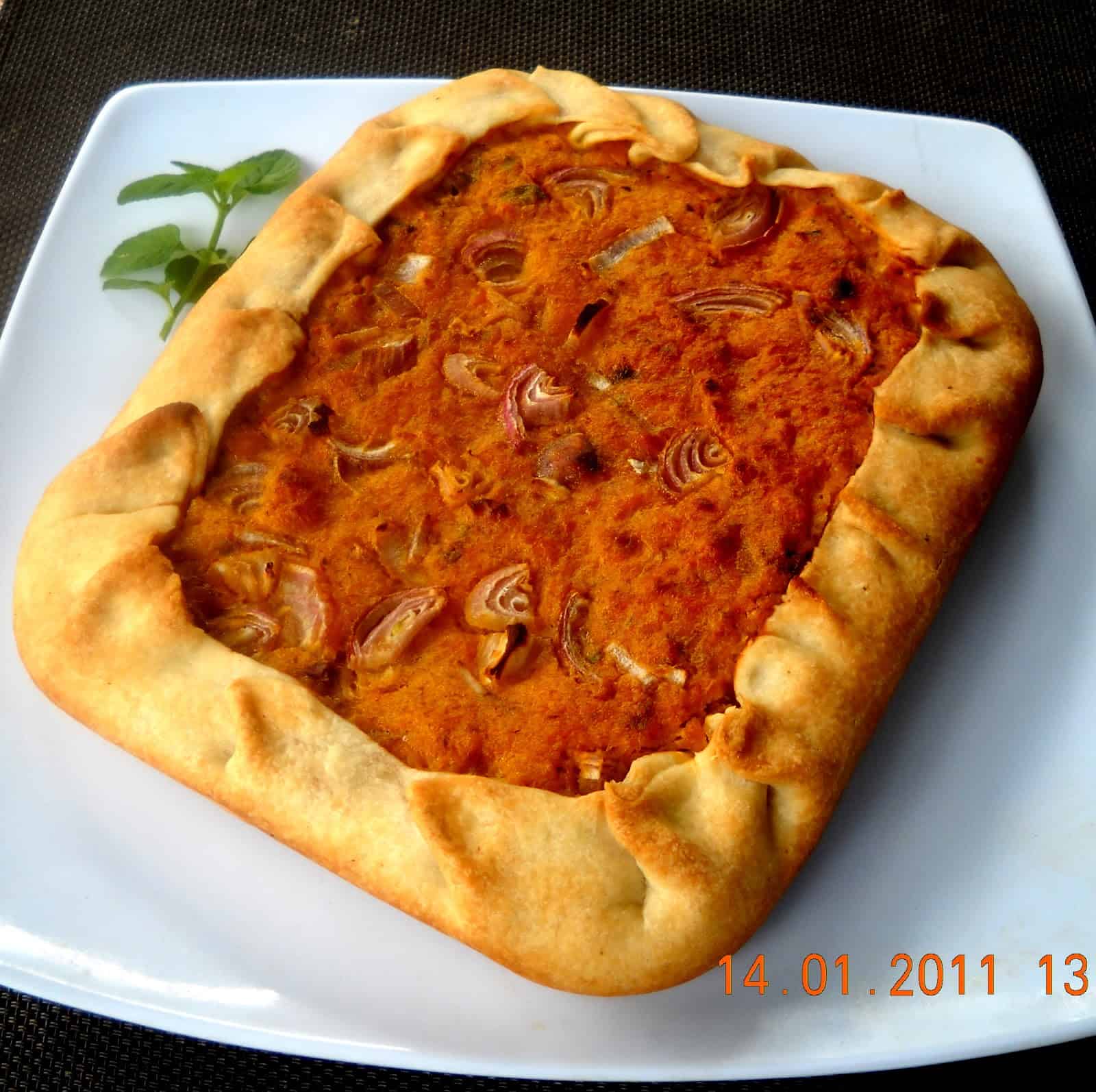 Es una tarta que me resultó particularmente sabrosa, además de bonita, liviana y bastante fácil de hacer. Para 2 personas y una tartera rectangular (porqué tiene que ser siempre redonda?) de 22 x 8 cms: