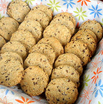 Mezclamos bien el resto de los ingredientes secos, incorporamos las semillas y luego el aceite y el agua. Amasamos un poco hasta integrar, volcamos sobre superficie ligeramente enharinada y con la mano o palotes estiramos hasta una altura de 1/2 cm. Con un molde cortante o tacita damos forma y colocamos en una asadera previamente engrasada.