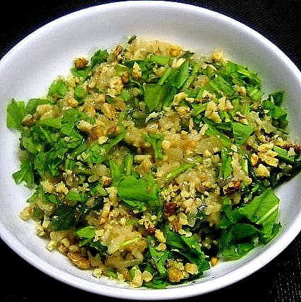 La cocción del arroz demandará unos 30′ (dependiendo del tipo de arroz); cuando vemos que está casi en su punto incorporamos la otra cucharada de manteca, 1 cucharada de parmesano rallado y la mitad de la radicheta; mezclamos bien, apagamos el fuego, tapamos y esperamos 10′ a que se termine de termine de cocinar el arroz y se amalgamen los sabores.