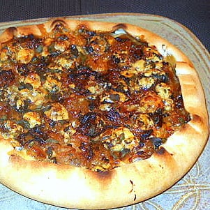 Con la ayuda de un palote y sobre superficie enharinada estiramos la masa bien delgada y cubrimos la tartera, previamente pincelada con aceite. Condimentamos el yogurt con sal, pimienta y nuez moscada y lo volcamos sobre la masa; distribuimos por encima las cebollas caramelizadas y el queso azul desgranado. Cortamos los trozos de masa remanente o los volcamos sobre el relleno.