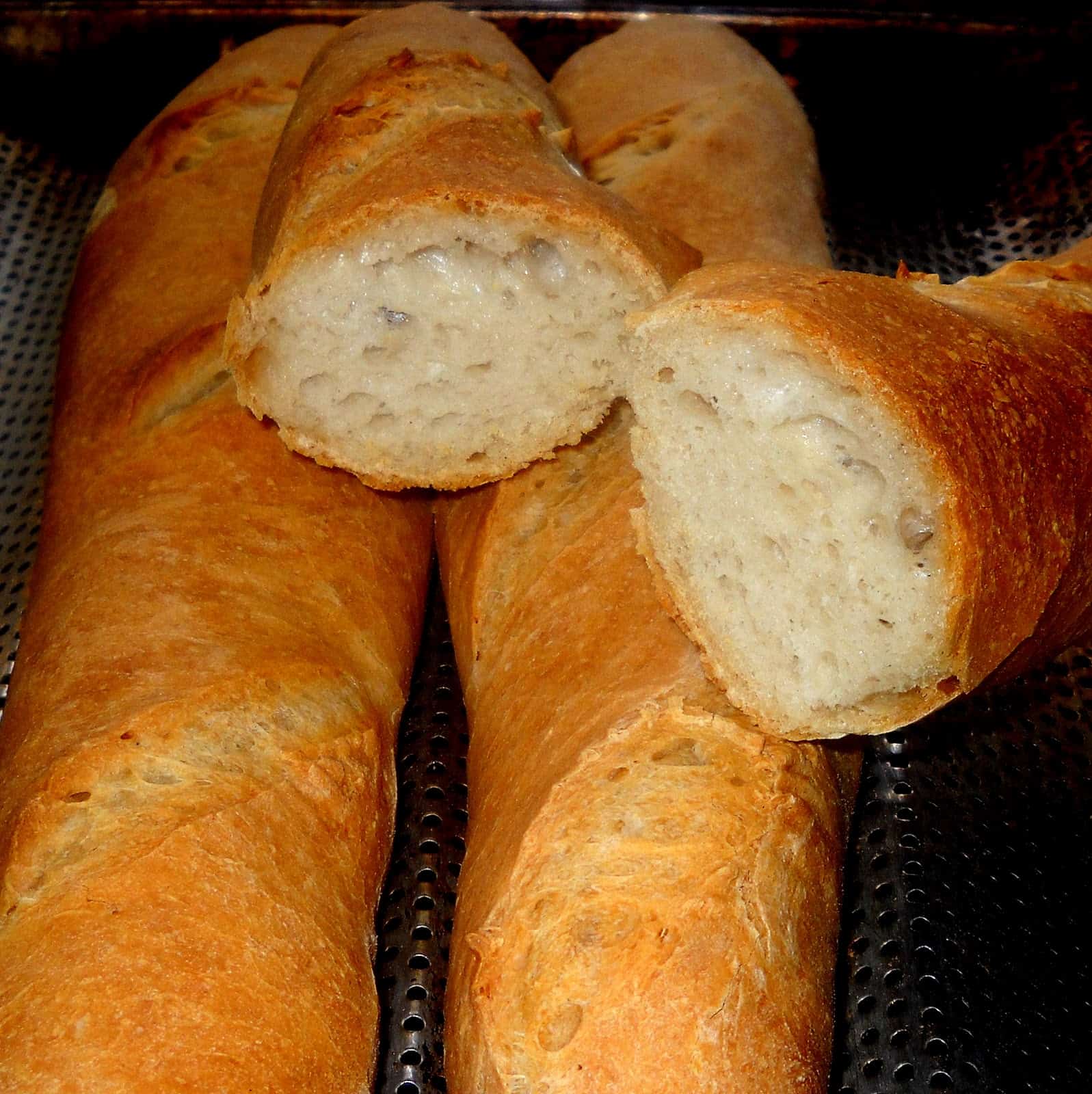 Horneamos por unos 20´ hasta que las baguettes se vean con un color marrón dorado intenso. Retiramos y dejamos horear sobre rejilla. Otro “truco” para lograr “la máxima crocantez” es hornear los últimos minutos con la puerta entreabierta de modo que los panes expulsen más humedad.