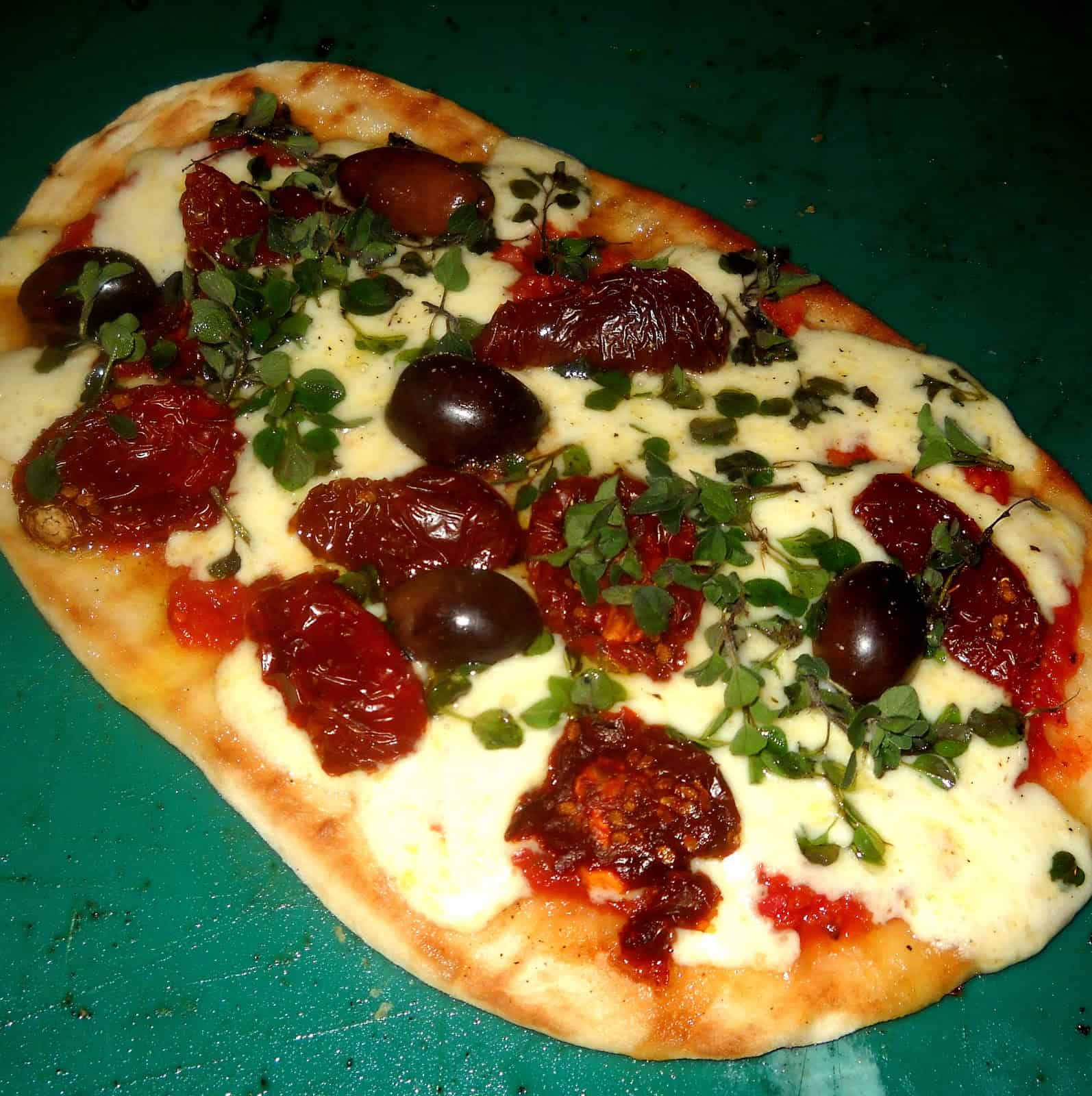 PIZZA A LA PARRILLA DE MUZZARELLA AHUMADA, TOMATES SECOS Y ORÉGANO FRESCO
