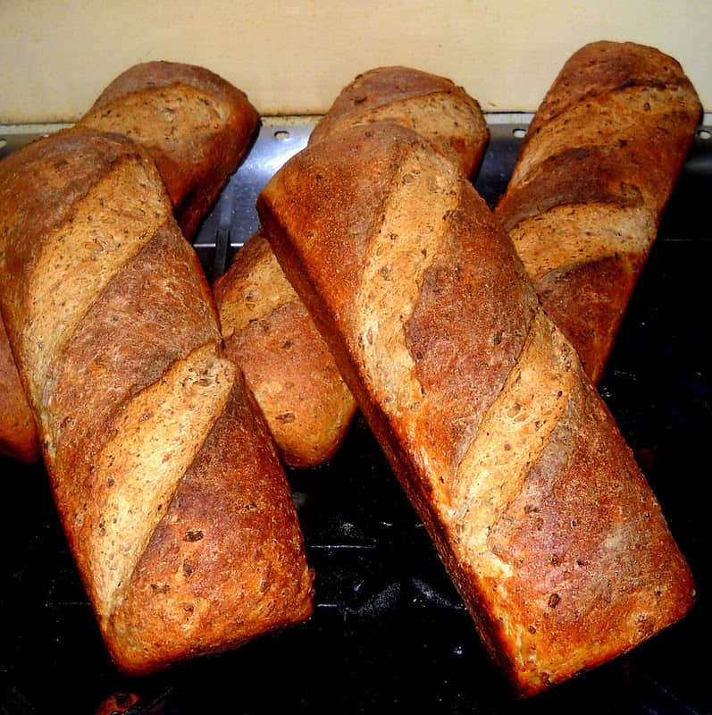 Horneamos en horno caliente (200*) y prehumidificado por 30´ a 35´; el pan debe lucir bien tostado y su base sonar hueca. Retiramos y dejamos orear sobre rejilla.