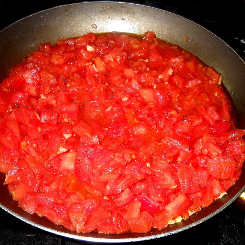 Unos minutos antes de poner a hervir la pasta, salteamos los ajos, el peperoncino y la pimienta en una sartén con el aceite y una pizca de sal; apenas el ajo comienza a colorear incorporamos los tomates picados y cocinamos a fuego suave por unos 5´; agregamos el perejil picado (es opcional) y corregimos sal.