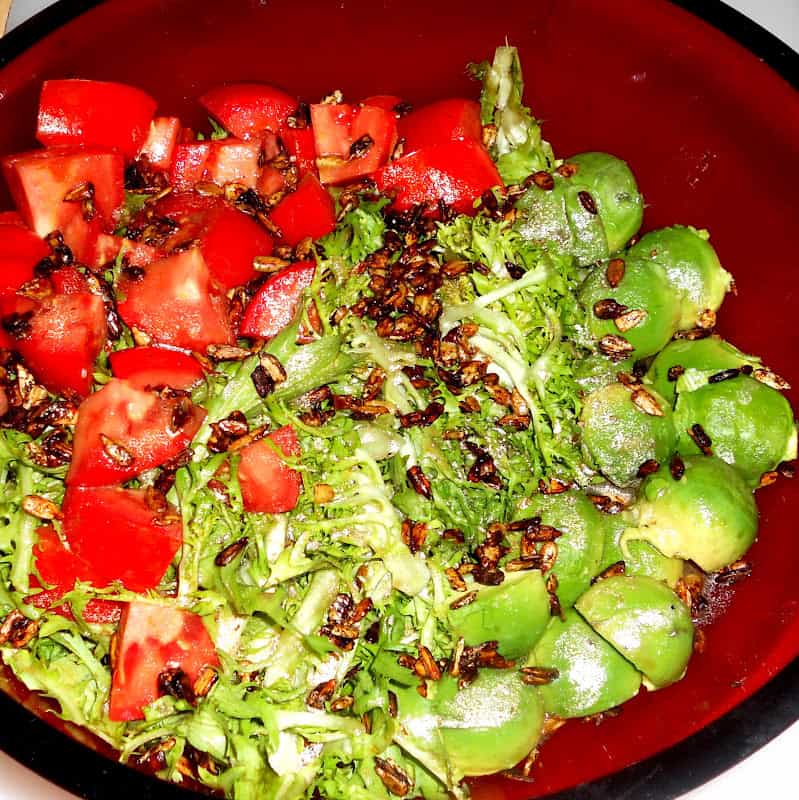 Disponemos las escarolas en una ensaladera, a sus costados los tomates y la palta, distribuimos por encima las semillas tostadas y regamos con la vinagreta.