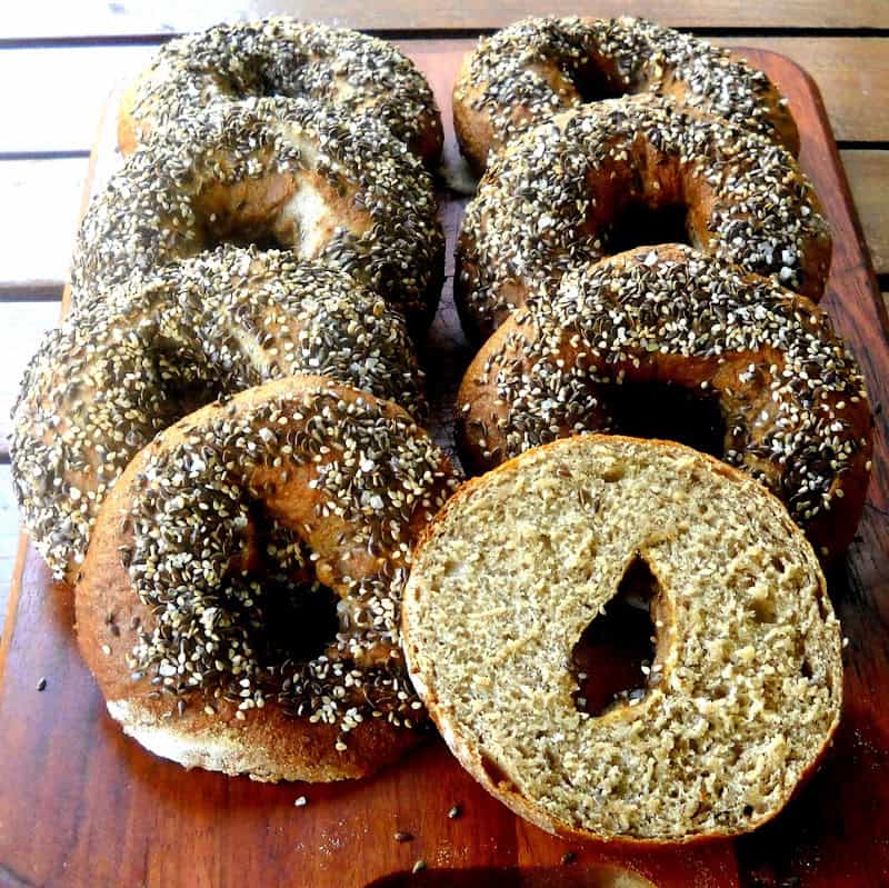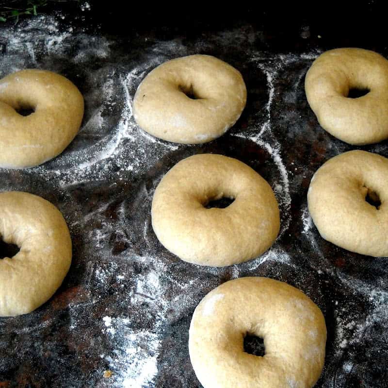 Hacemos una esponja con la mitad de la harina, la levadura, la miel y el agua y esperamos a que comience a espumar, aprox 30´. Incorporamos luego el resto de los ingredientes y amasamos por 10′ a 15´, la masa debe quedar firme pero suave y maleable. Dejamos levar en bol cubierto hasta que duplique su volúmen, aprox. 1 hora.