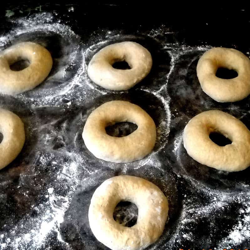 Con el dedo pulgar hacemos un agujero en el centro de cada bollo y vamos girándolo suavemente hasta lograr un diámetro regular de unos 5 cms.