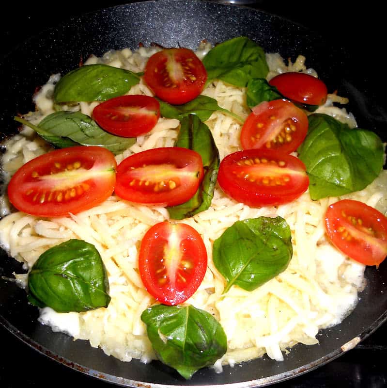 Vertemos la mitad de la mezcla dentro de una sartén mediana con un poco de aceite caliente; aplanamos bien con una cuchara, añadimos el queso rallado, el tomate y las hojas de albahaca, cubrimos con el resto de la mezcla y cocinamos a fuego bajo unos 10´de cada lado adicionando algo de aceite al darla vuelta; debe verse bien cocida.