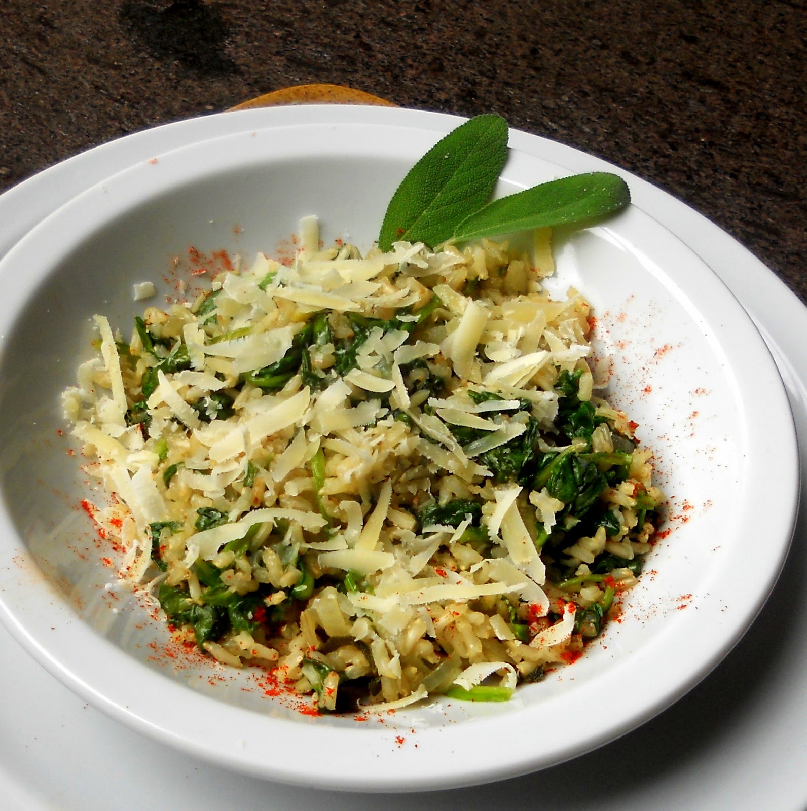 En una sartén grande salteamos la cebolla con la manteca y el aceite de oliva; cuando comienza a colorear añadimos el arroz integral y las hojas de salvia fresca en tiras delgadas, mezclamos y luego de 2´o 3´ incorporamos el agua caliente, salamos y cocinamos hasta que estén casi a punto.