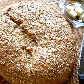 Damos al pan la forma deseada, lo colocamos sobre una asadera engrasada o enharinada, lo pincelamos con agua o aceite, floreamos con los granos reservados de quinoa, cubrimos con un repasador húmedo y volvemos a dejar levar hasta que -casi- duplique su volúmen, unos 45´ aunque si hace mucho calor (como ahora en Buenos Aires) con 30´ puede ser suficiente.