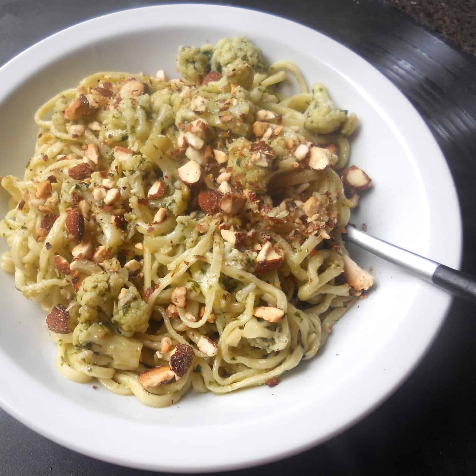 TALLARINES DE SÉMOLA CON COLIFLOR, OLIVAS VERDES Y ALMENDRAS TOSTADAS