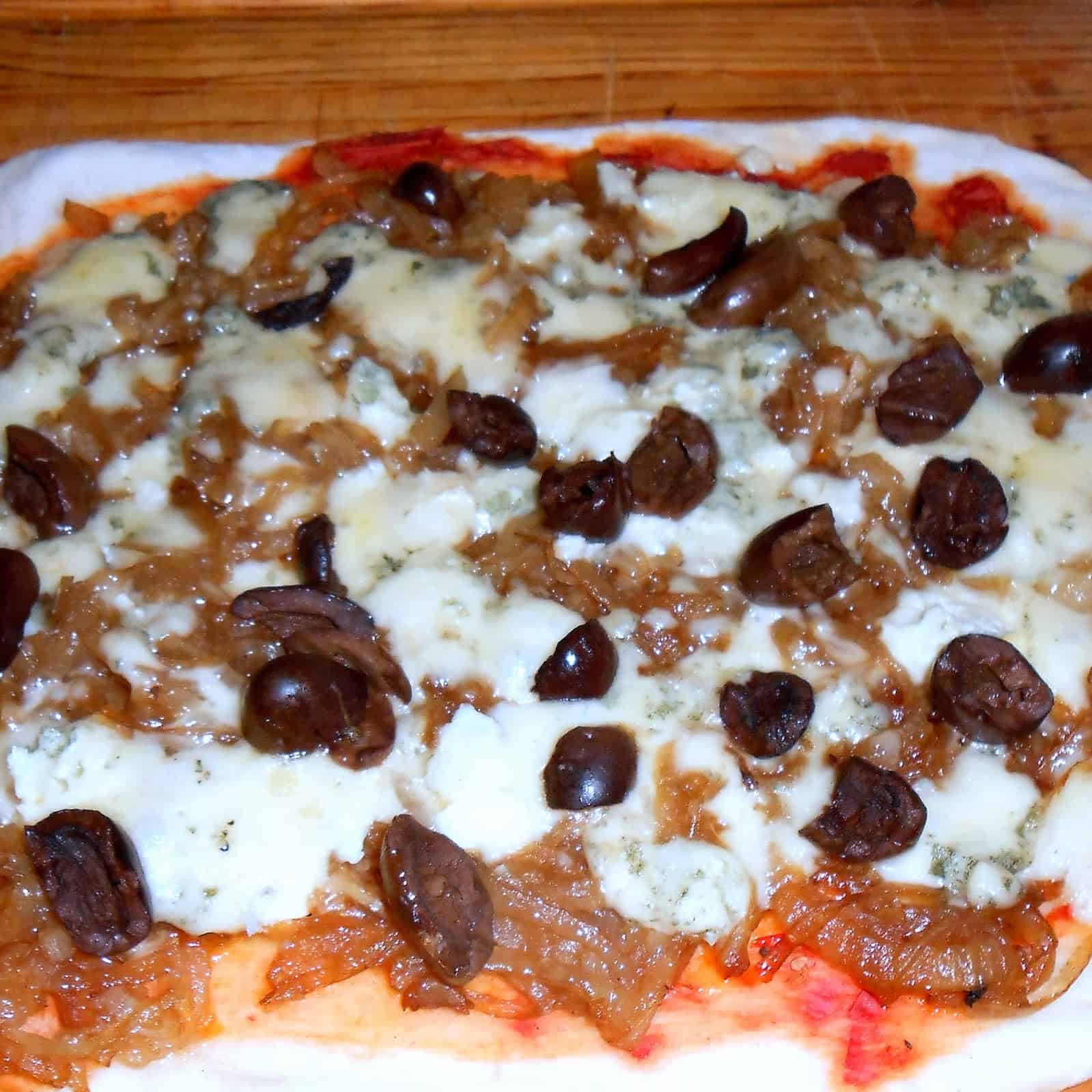 PIZZA A LA PIEDRA DE CEBOLLA CARAMELIZADA, ACEITUNAS NEGRAS, QUESO DE CABRA Y MUZZARELLA