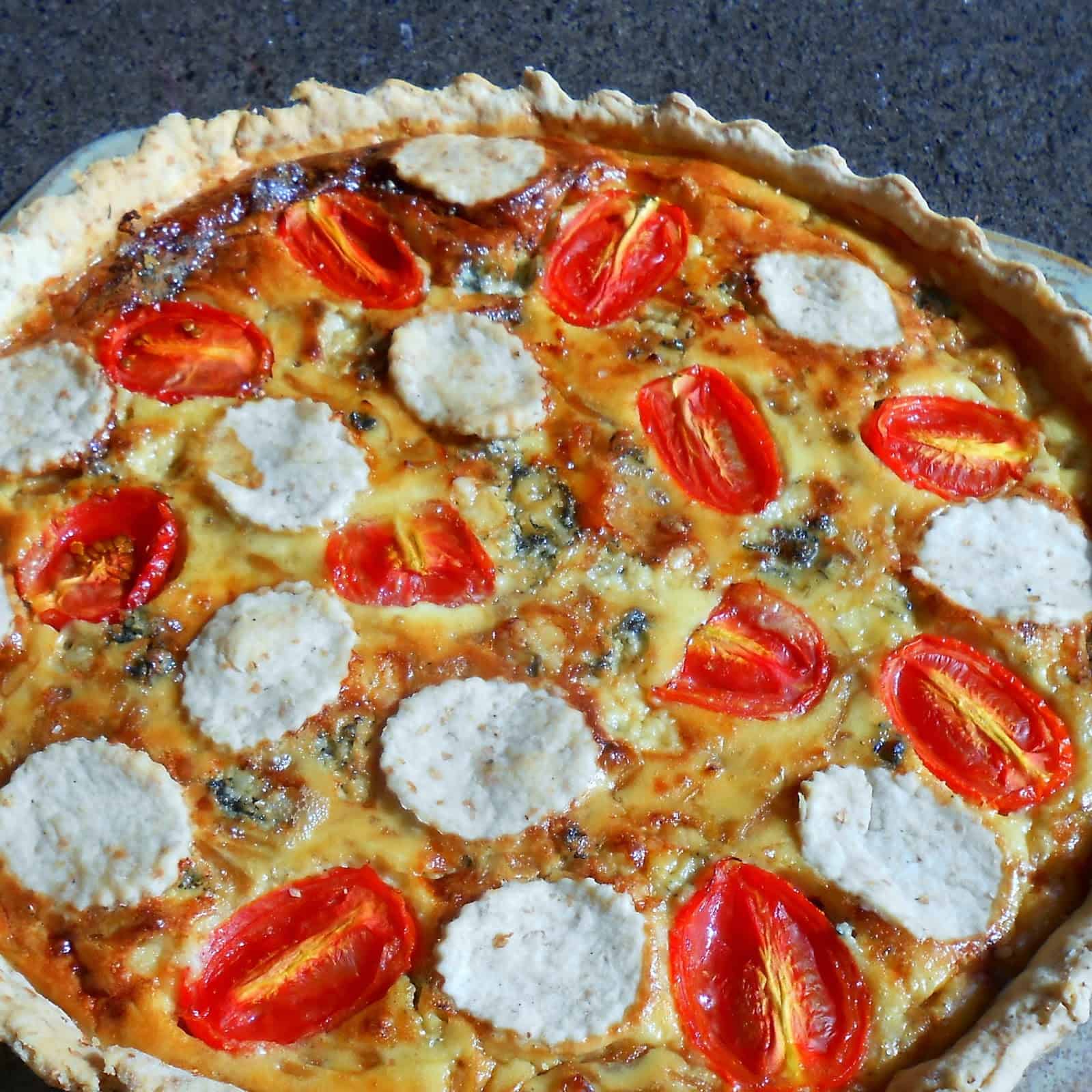 Con la ayuda de un palote estiramos la masa en forma redondeada y de un diámetro al menos 5 cms mayor al de la tartera. Volcamos sobre la masa la cebolla carameliza, sobre esta el huevo con el yogur y distribuimos por encima el queso azul desgranado y los tomates cherry boca arriba.