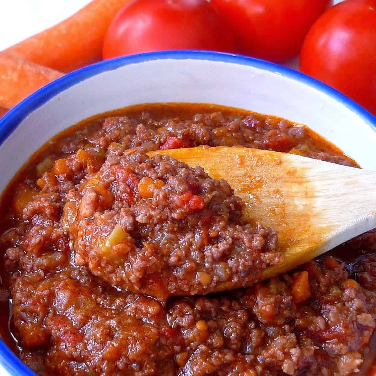 En la clase de anoche con Carola preparamos una salsa boloñesa con unas cuantas modificaciones sugeridas por la alumna, al punto que propuso la denomináramos ” Boloñesa-Carola”…(los ingredientes principales omitidos fueron la panceta, la carne de cerdo y el apio, el cual volví a incluir en esta receta). Aún en su austeridad la salsa resultó muy sabrosa acompañando una pasta casera de espinacas. Para 4 a 6 platos de pasta: