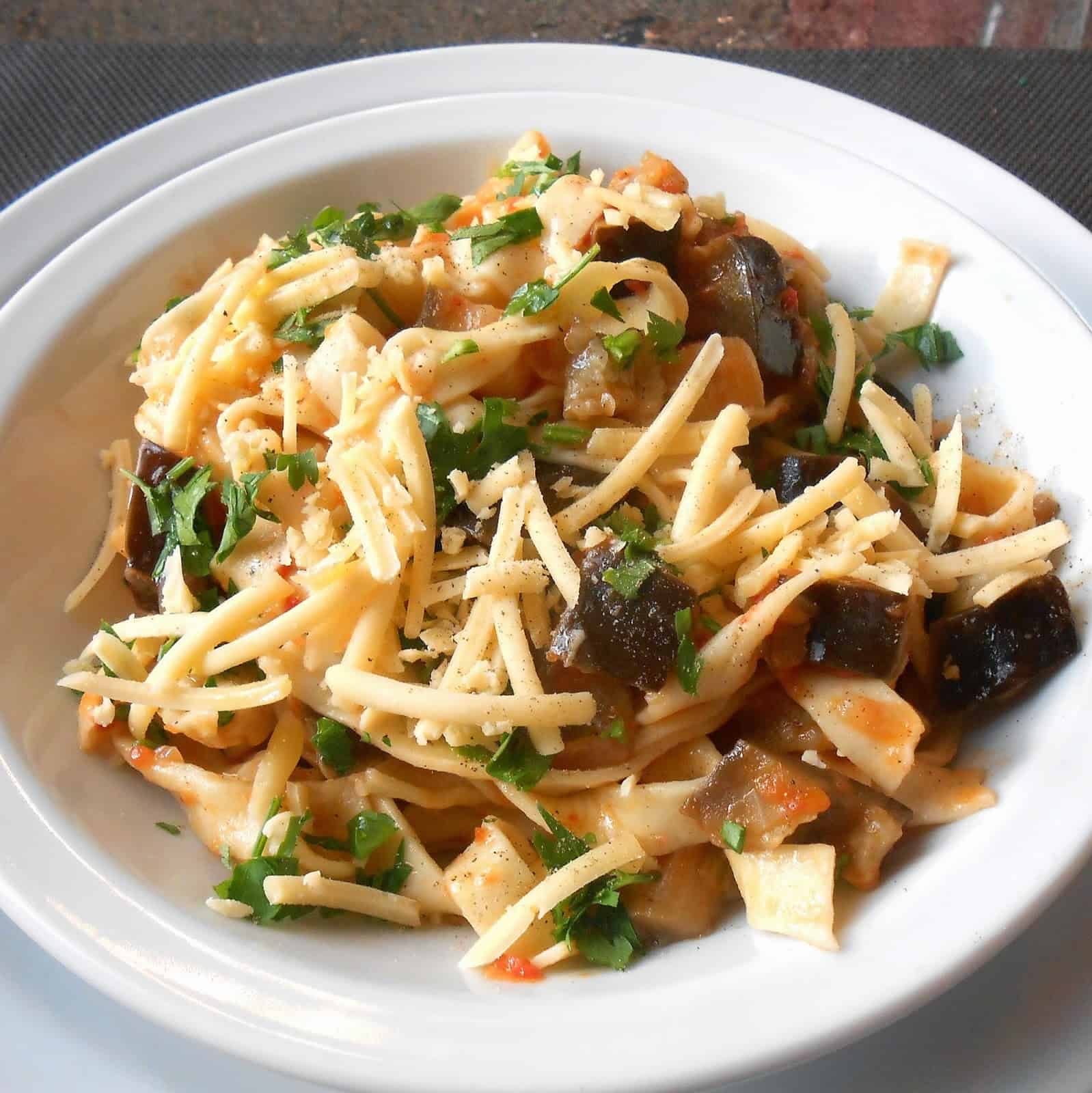 TALLARINES CASEROS CON SALSA DE BERENJENAS Y TOMATES FRESCOS