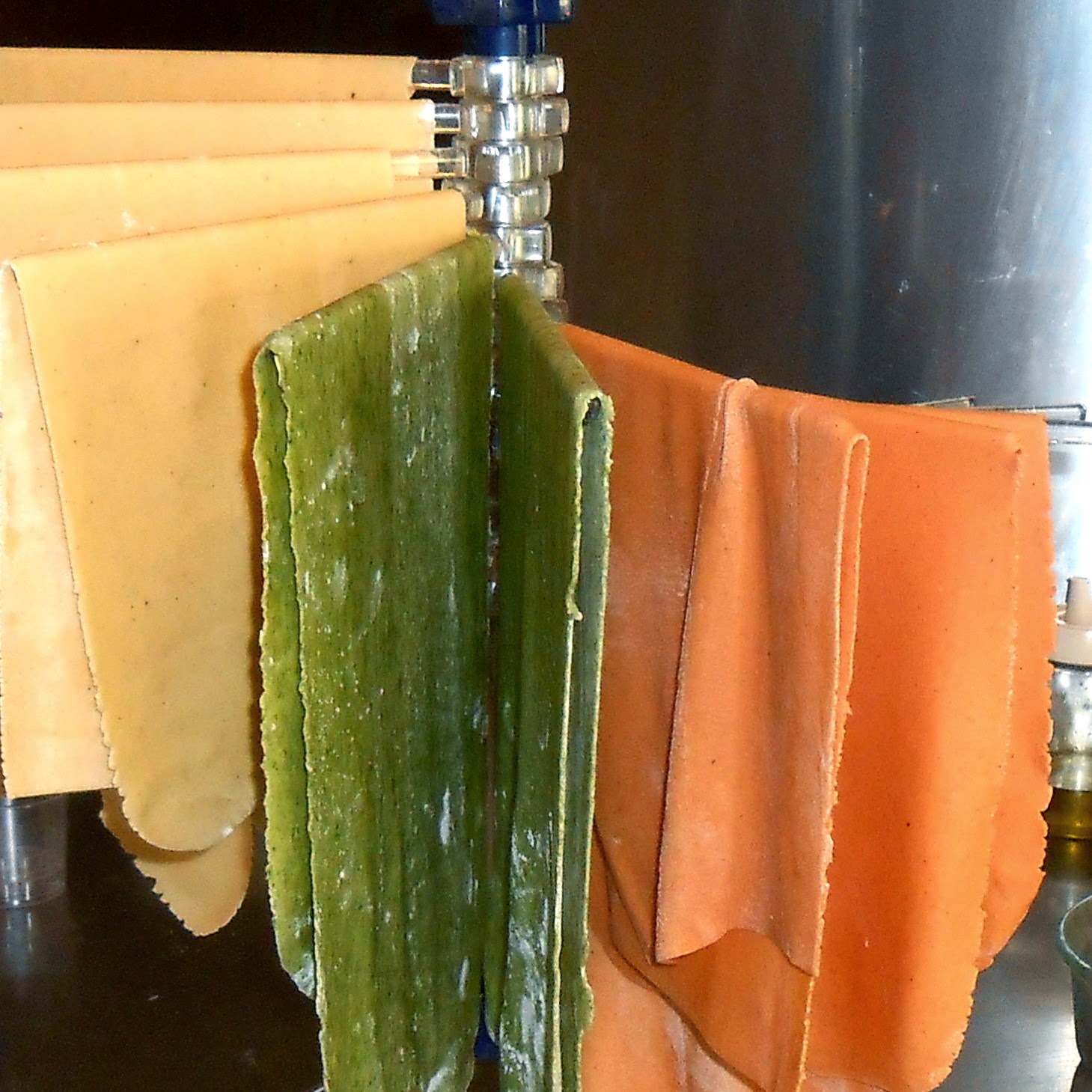 Preparamos la masa del modo habitual (ver “Masa para Pasta al Huevo, Técnicas Básicas“), solo que en esta oportunidad procesamos previamente los huevos con el saborizante (espinacas o tomates).