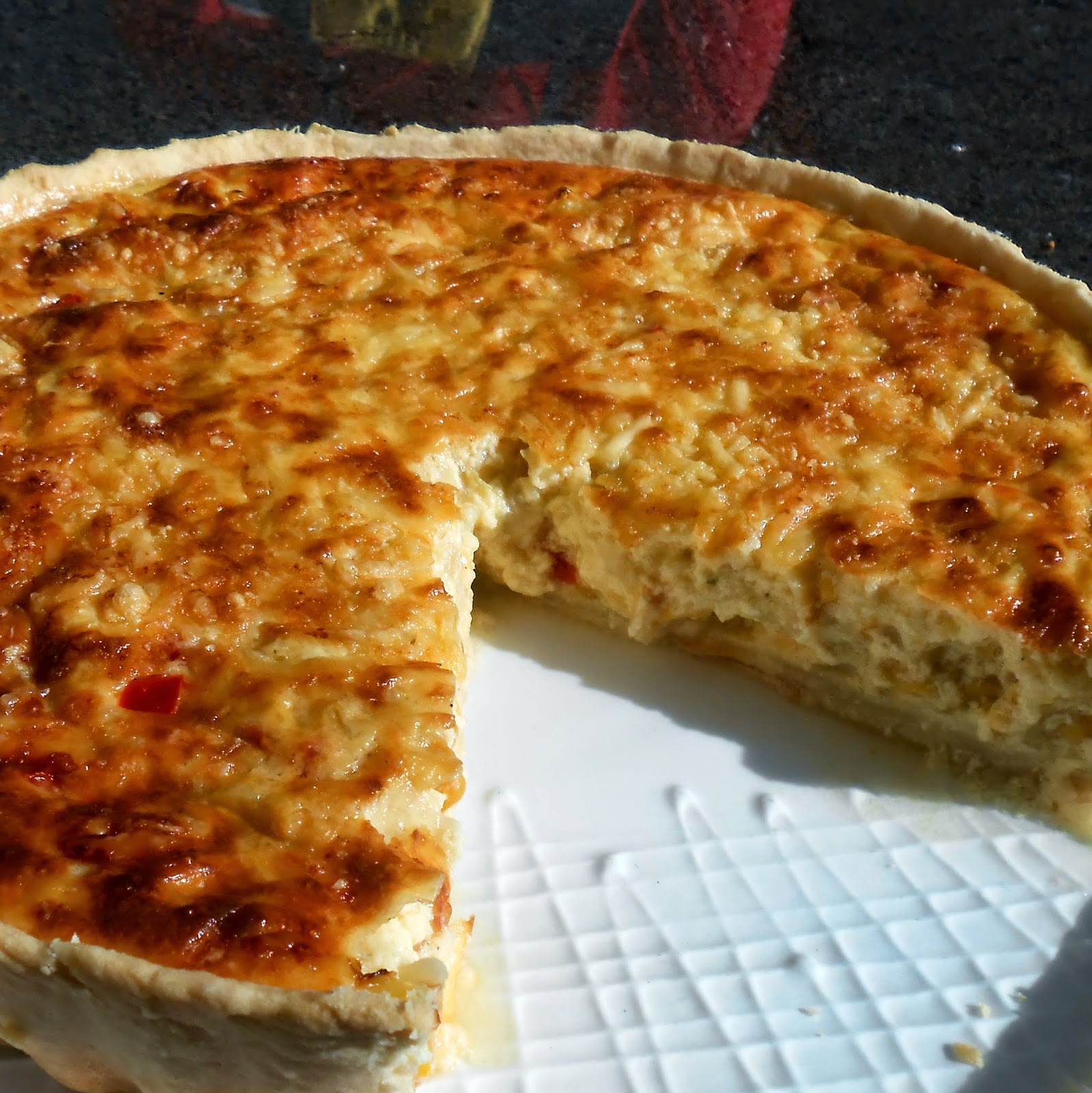 Forramos la tartera recostando hacia afuera los excedentes de masa; echamos dentro el relleno floreamos con el queso rallado, cortamos los excedentes de masa o los volcamos sobre la mezcla y horneamos a 180* (3/4 temperatura) por unos 45´ hasta que el queso haya gratinado y la masa se vea bien cocida.