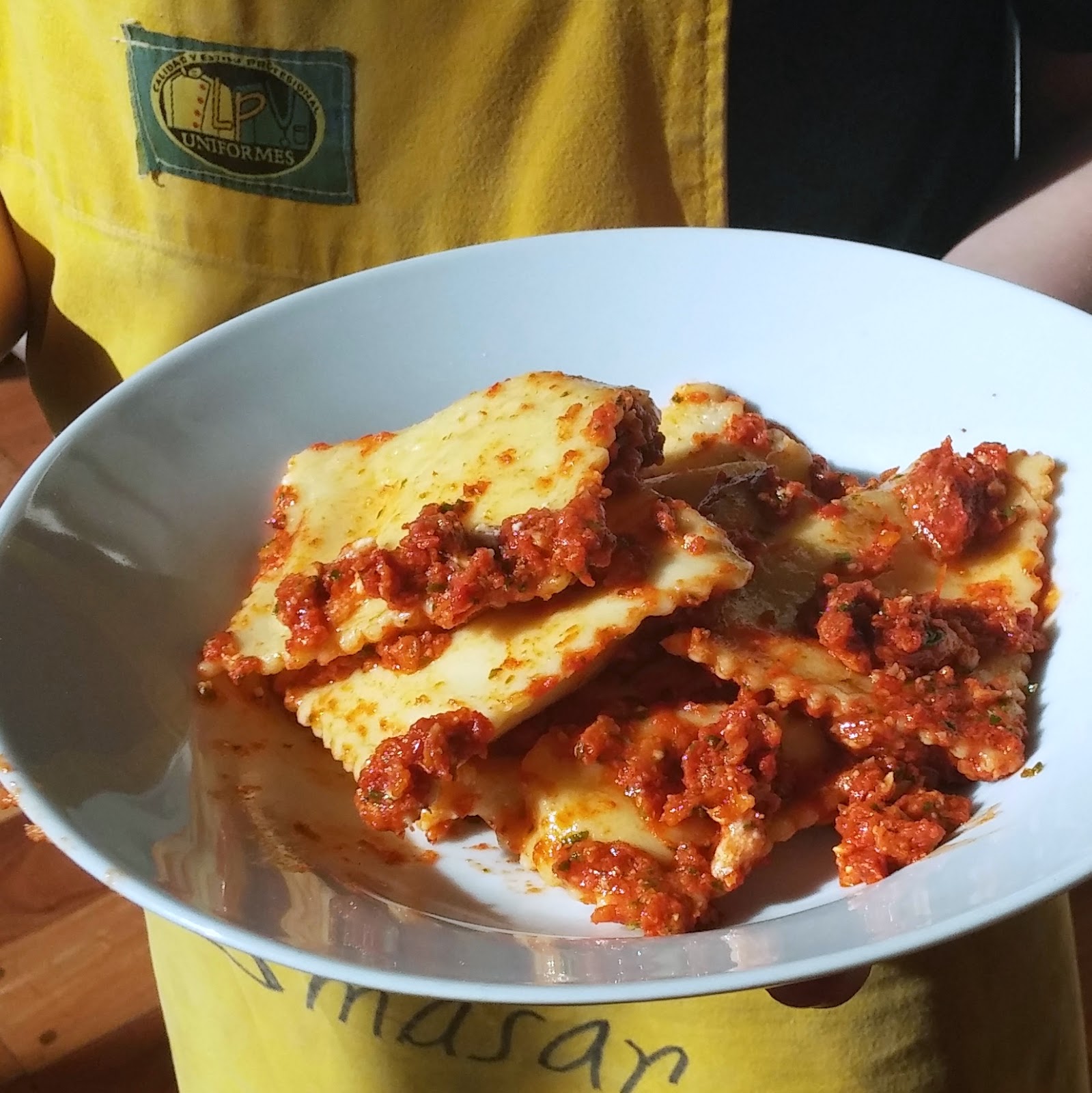 Estiramos la masa hasta el penúltimo punto 9 de la máquina y la dividimos en 2 ó en 4 tiras de tamaño similar. Sobre una de las tiras vamos colocando cucharaditas del relleno dejando aprox 1,5 cm entre cada una, pincelamos los bordes con agua, cubrimos con la otra tira, presionamos suavemente para quitar el aire, dar forma y sellar y con el cortapastas cortamos las piezas.