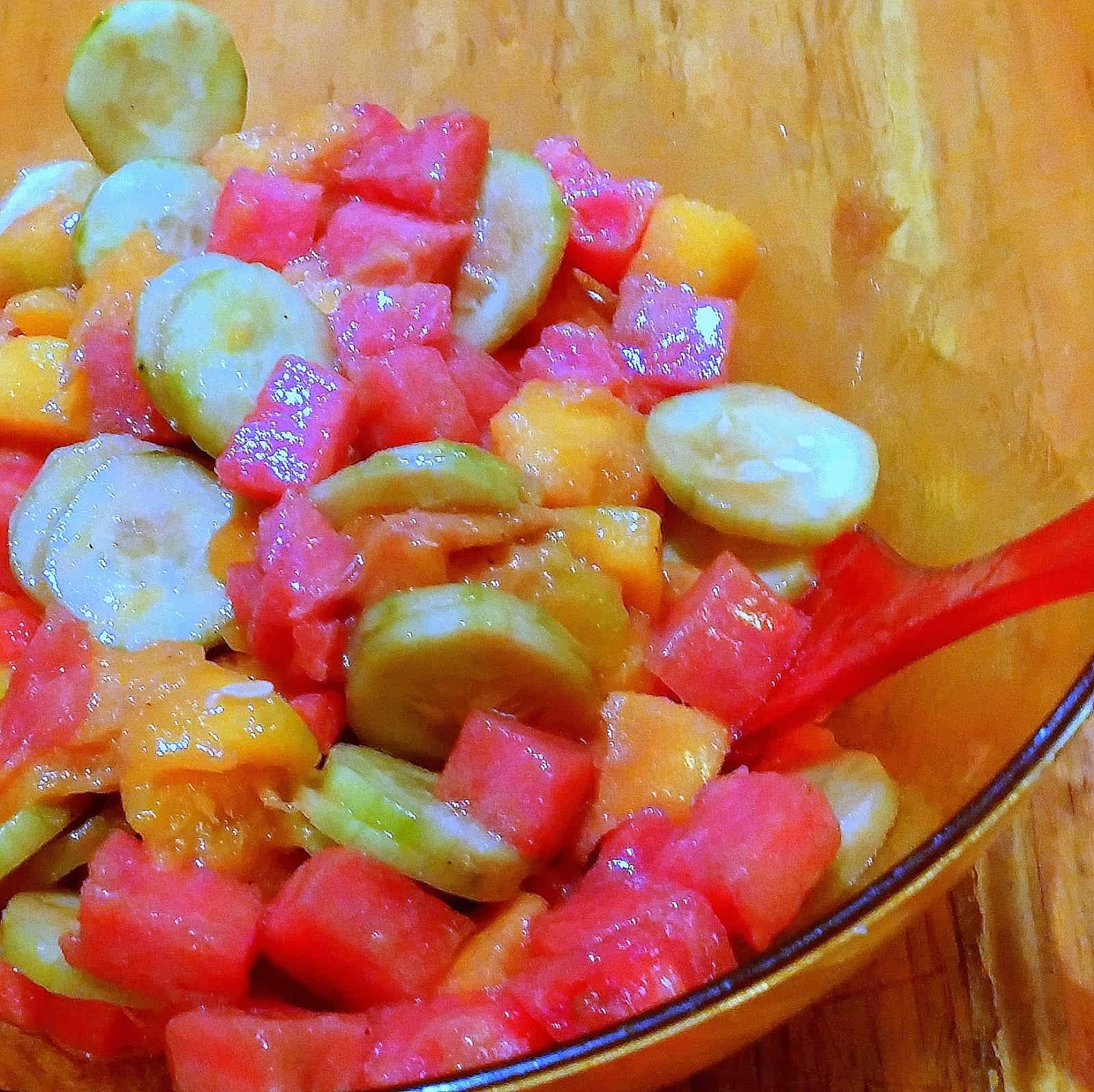 Mezclamos el mango, la sandía y el pepino y los disponemos sobre una ensaladera; regamos con la vinagreta y servimos.