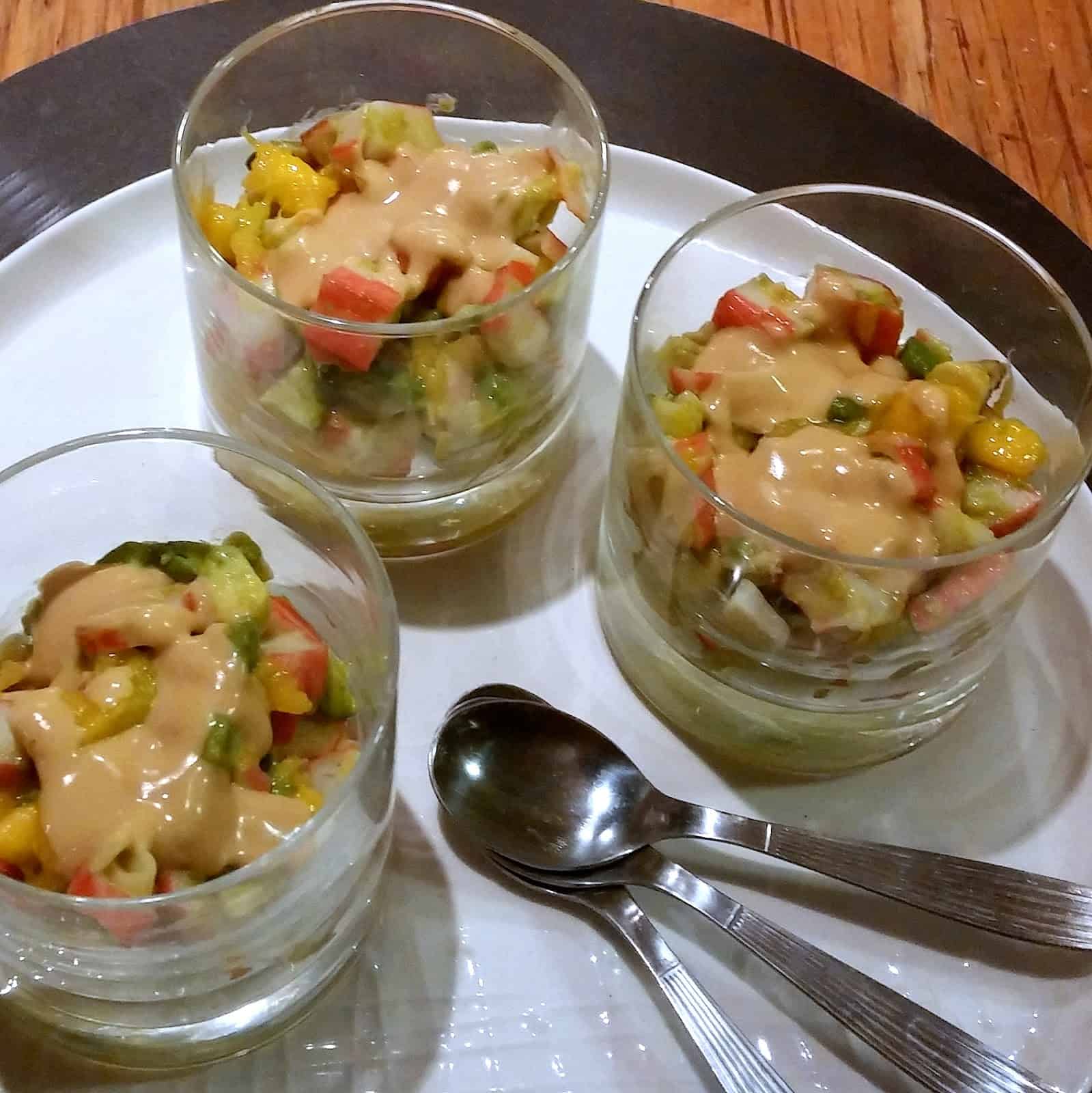 En un evento que tuvimos el 31 de Diciembre ofrecimos entre otras entradas esta ensalada que practicamente nadie dejó de repetir, éxito total! (fue servida en vasitos más pequeños, como un finger food más que como una entrada cual el caso de la foto de una comida que preparamos posteriormente. La receta, para 4 a 6 personas: