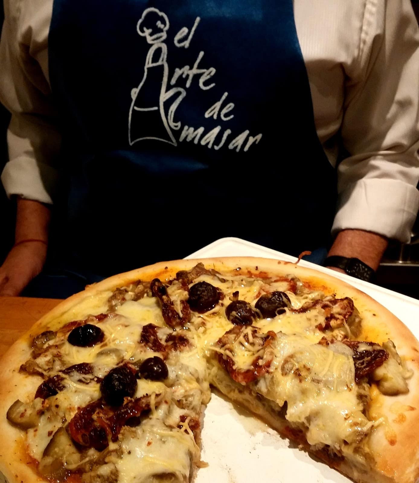 Reposada la masa la aplastamos dándole forma redondeada y colocamos sobre la pizzera previamente aceitada; con la mano vamos estirando la masa hasta cubrir completamente la base dejando algo más gruesos los bordes.