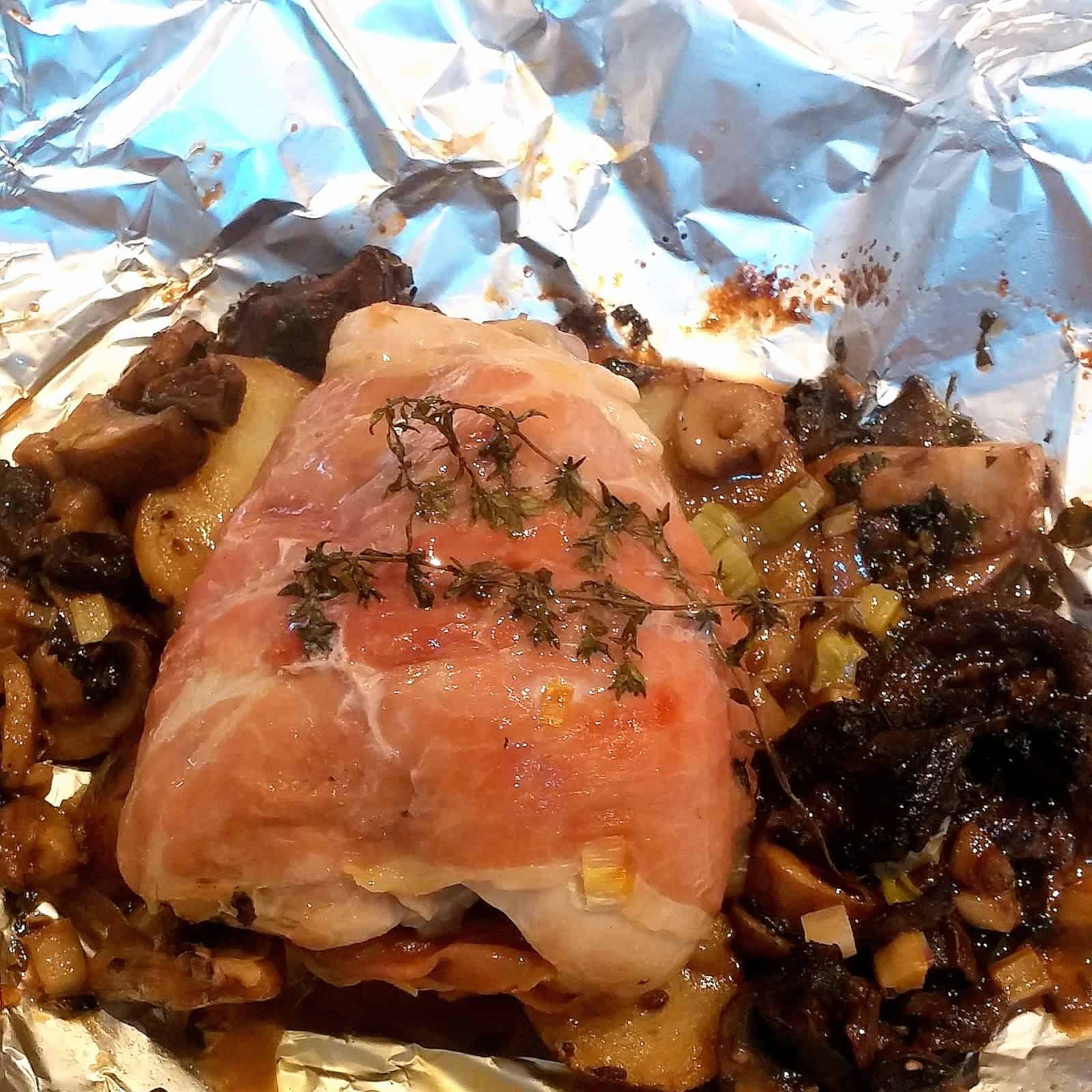 En cada papel de aluminio hacemos un colchón con las papas, salpimentamos y colocamos por encima los muslos y las ramitas de tomillo. Distribuimos alrededor los hongos y regamos cada muslo con el fondo de cocción y el marsala. Cerramos bien los paquetes y horneamos a 200* por 30´.