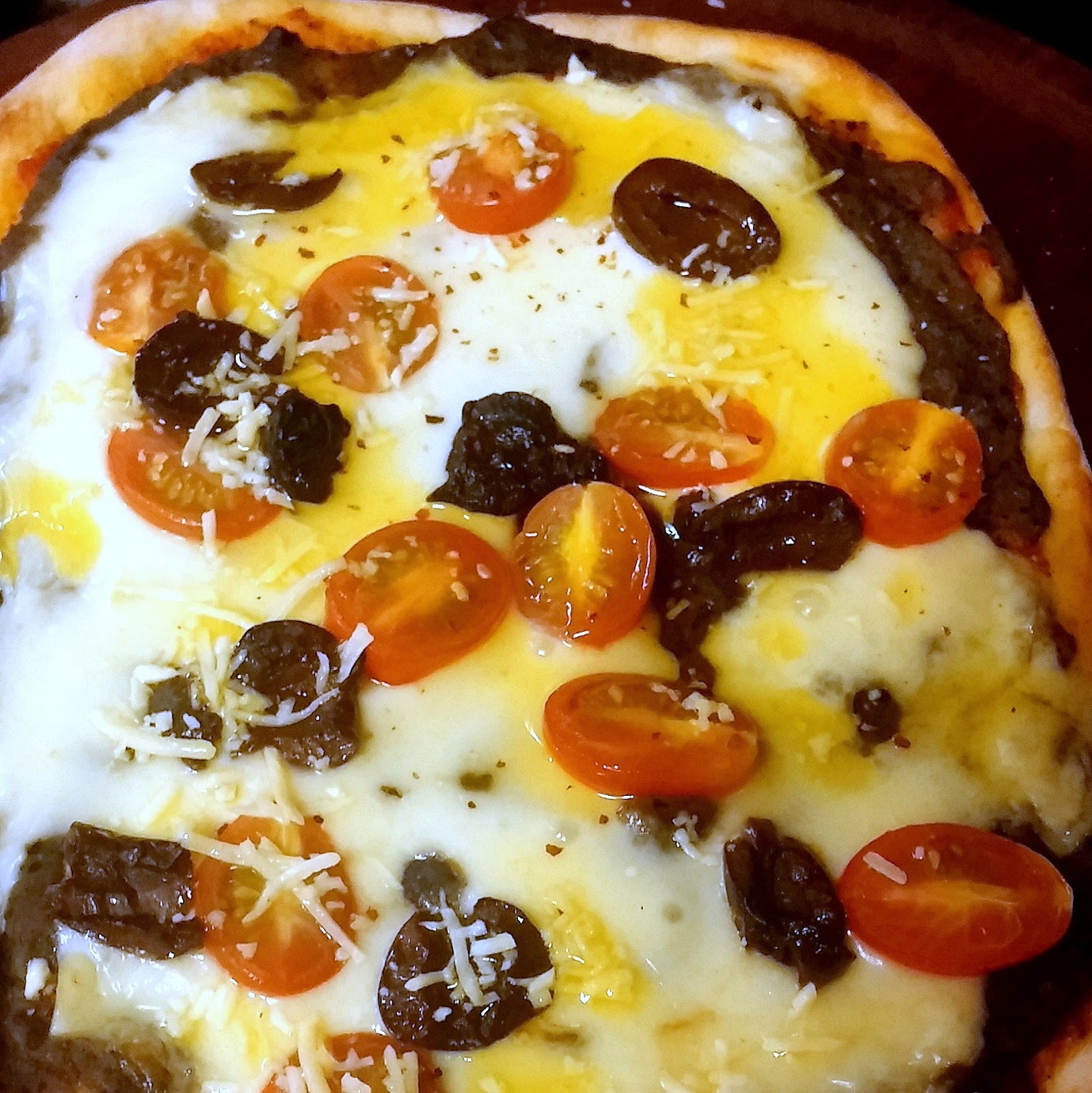 A la hora del servicio distribuimos sobre la/s pizza/s la berenjena procesada y por encima la muzzarella, las olivas negras descarozadas cortadas por la mitad y los tomates cherry boca arriba. Floreamos por último con el sardo rallado.