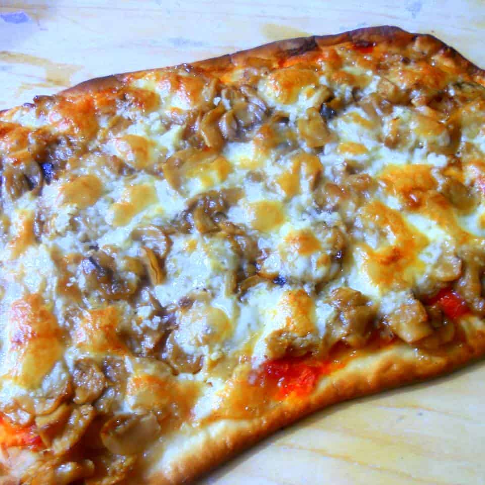 Distribuimos sobre la pizza la muzzarella, por encima los champiñones y el gruyere.