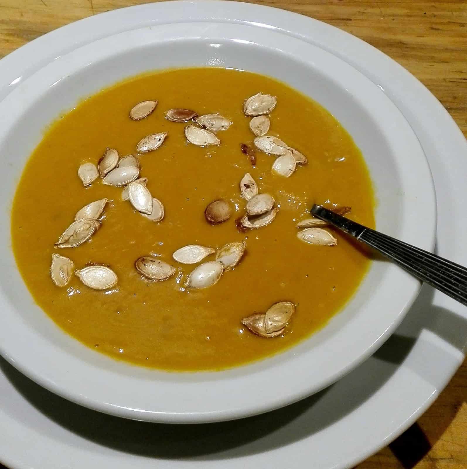 Revisamos la sal y servimos floreando con semillas tostadas, y/o queso rallado y/o croutons. Las semillas empleadas en este caso fueron las del mismo zapallo limpiadas y horneadas por unos minutos hasta que se volvieron crocantes.