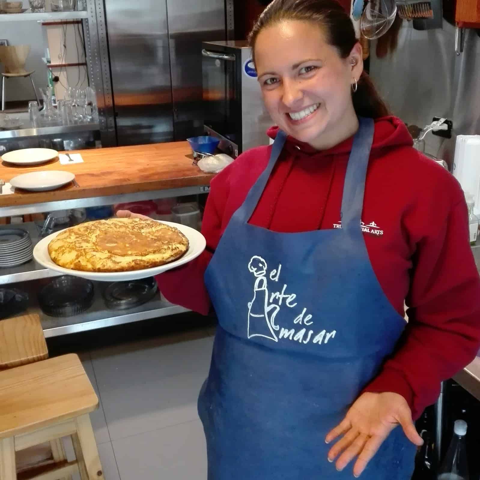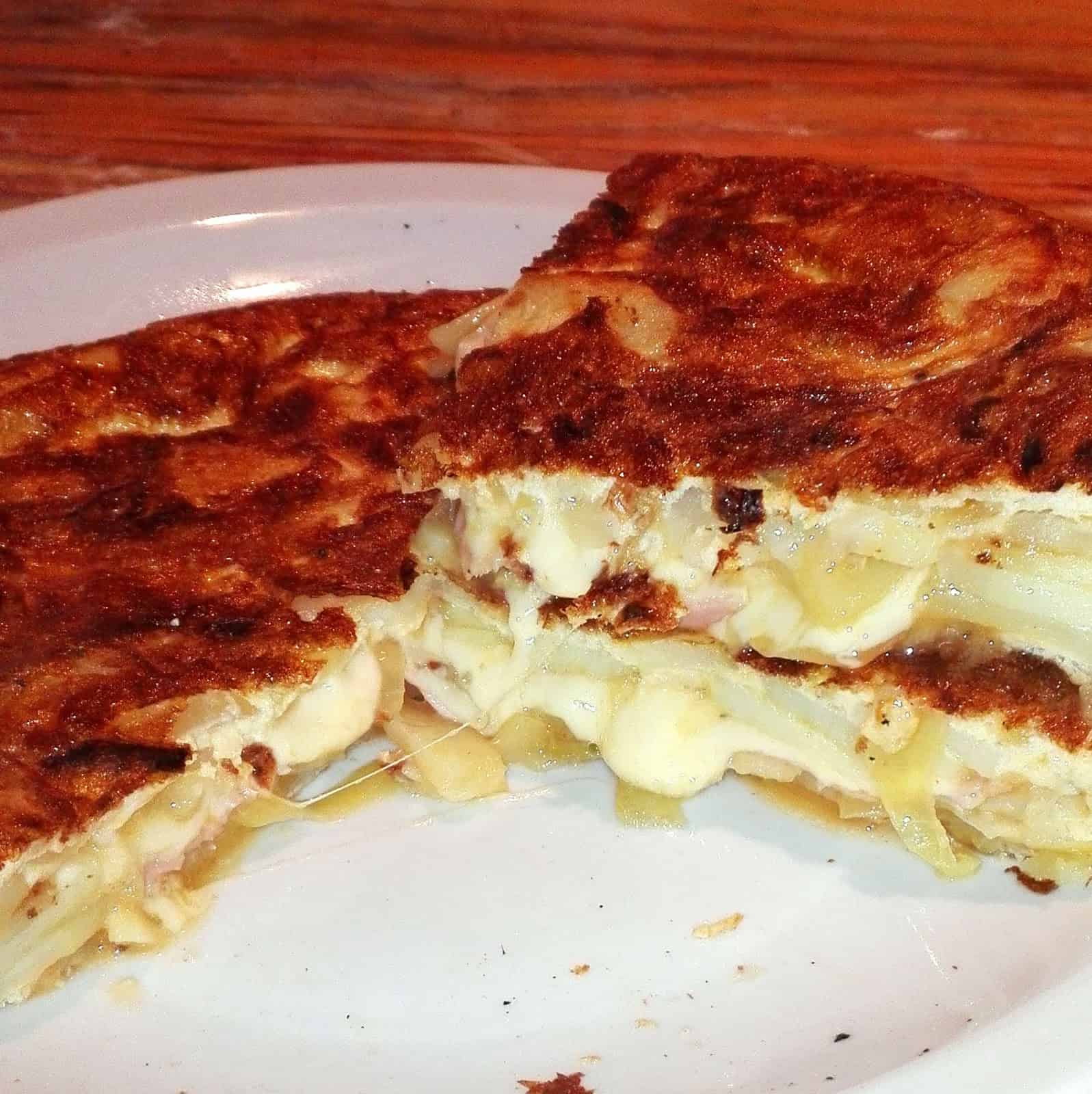 Una joven de los Estados Unidos me pidió para una clase privada, y para mi sorpresa, además de nuestras típicas empanadas de carne (masa incluida, desde ya), una tortilla española de papas rellena de jamón y queso, ya que en su viaje a España la había comido y le había gustado tanto que quería aprender a prepararla. Por supuesto acepté el desafío, siempre una oportunidad de aprender. Y el resultado por suerte dejó muy satisfecha a Nicole y al que suscribe. La receta, para 4 porciones en una sartén de 25 cms de diámetro, o menos si la prefieren más gruesa: