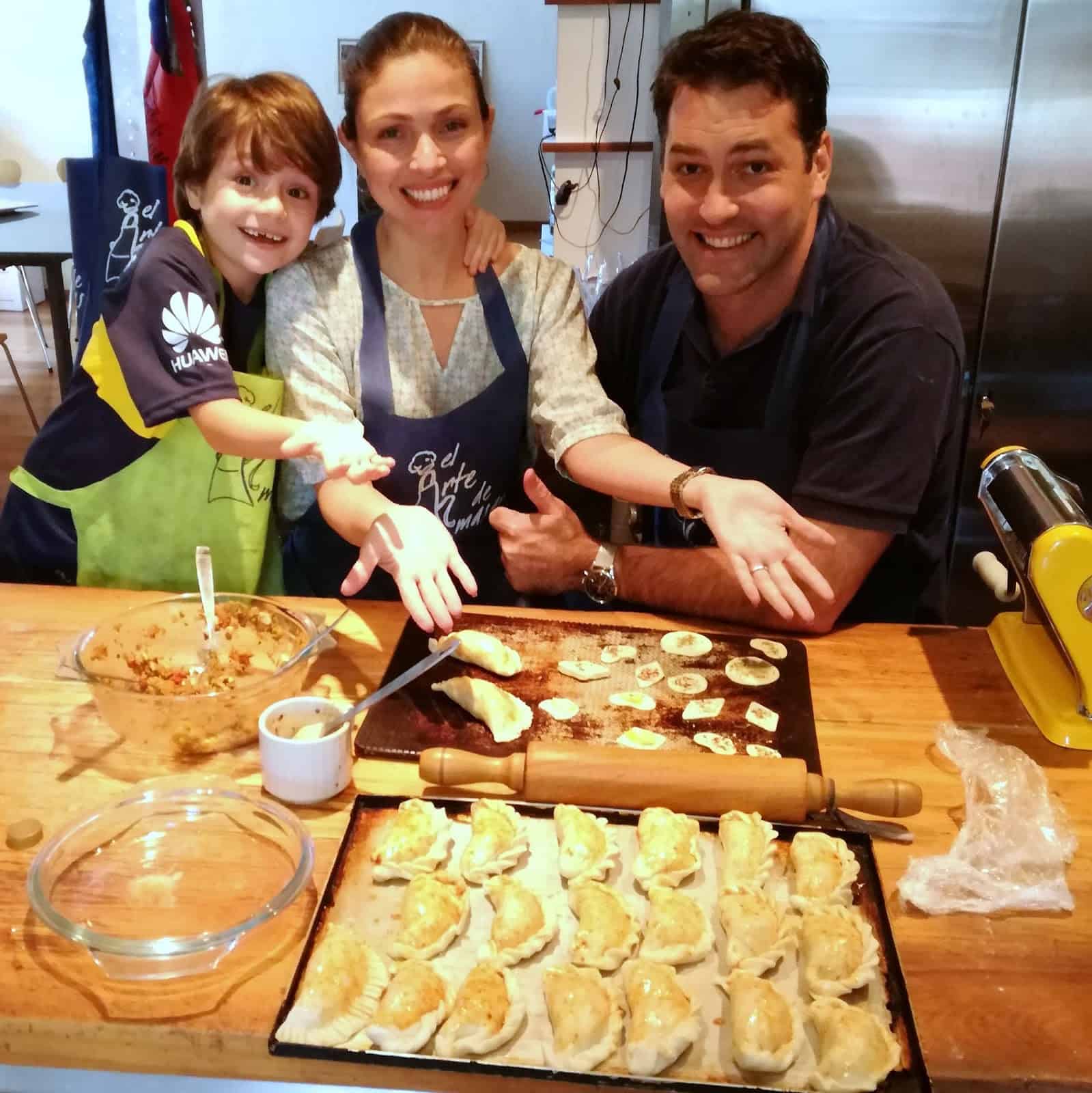 Tuvimos una lindísima clase de cocina con un matrimonio de extranjeros y su hijo de 7 años, la suerte acompaño y las empanadas resultaron muy sabrosas, jugosas y, no menos importante, livianas. La receta, para 18 a 22 empanadas: