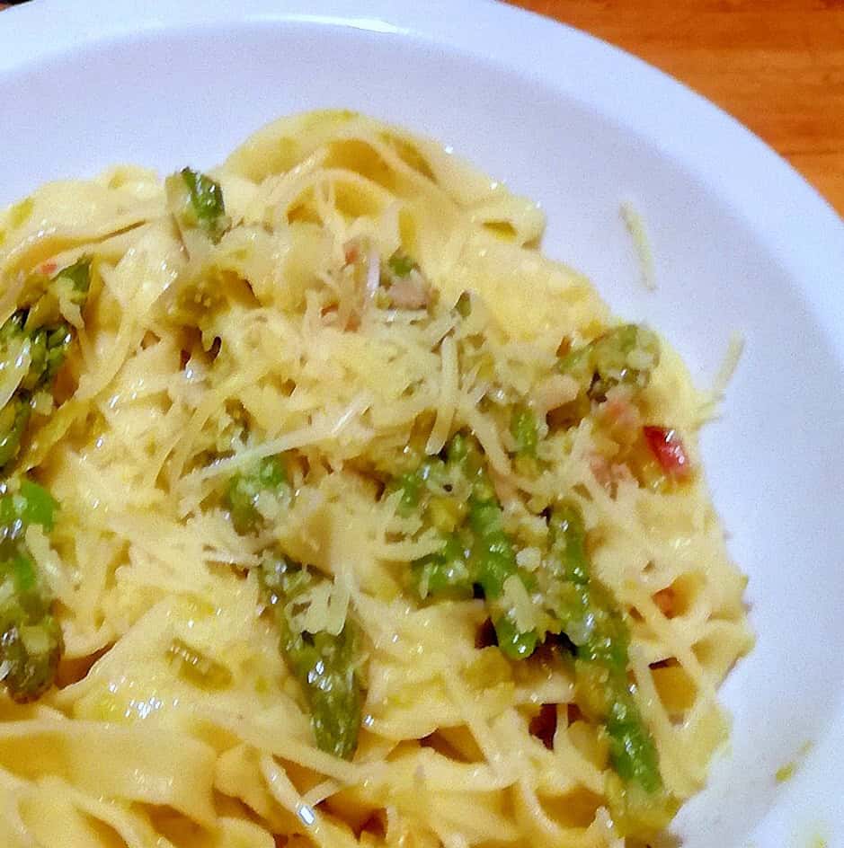 En una sartén grande con el aceite de oliva freímos a fuego medio las tiras de panceta hasta que comience a volverse crocantes, de 5’a 10′; incorporamos los espárragos procesados y continuamos la cocción por otros 5′-7′.