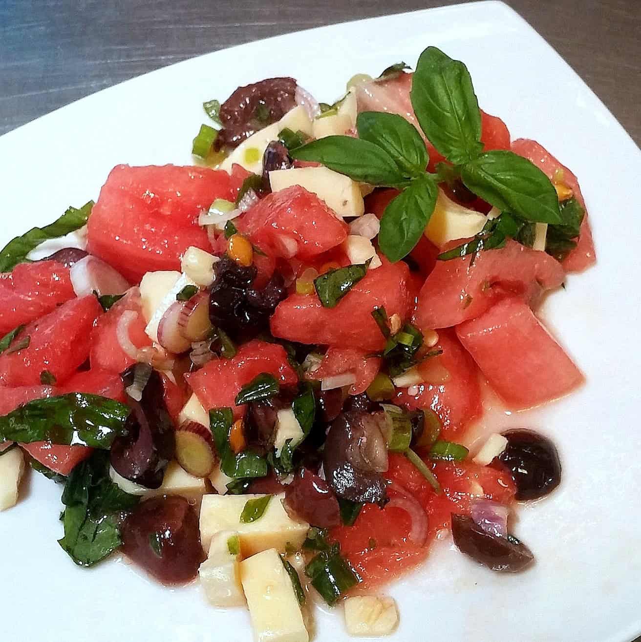 Cortamos la sandía en trozos medianos, la muzzarela en trozos pequeños, las aceitunas negras en rodajas, la parte blanca del verdeo en rodajas y la parte verde picada