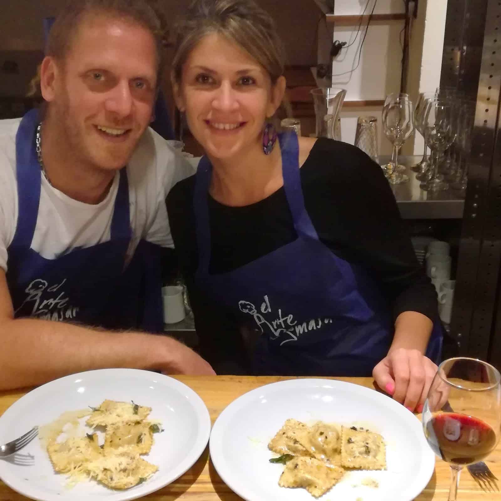 Una vez reposó la masa, la dividimos en 4 y estiramos cada una hasta el punto 7 de la máquina de pastas. Enharinamos la base de una tira, la colocamos sobre el molde raviolero elegido y con una cucharita vamos colocando el relleno. Cubrimos con otra tira, presionamos suavemente y luego pasamos un rodillo de modo de marcar y cortar. Volcamos sobre la superficie de trabajo y con un cortapastas completamos el cortado si hace falta. Repetimos con las otras tiras y recuperamos y volvemos a estirar la masa excedente.