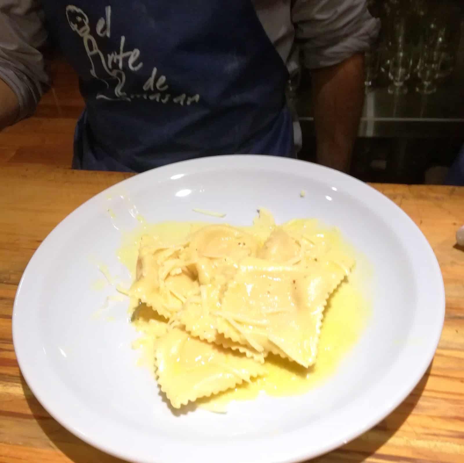 Estiramos la pasta hasta punto 7 de la máquina y dividimos en tiras de tamaño similar. Enharinamos la parte inferior de una tira y la colocamos sobre el molde raviolero. Con una cucharita vamos colocando el relleno, cubrimos con la otra tira, presionamos suavemente con las manos para quitar el aire y luego pasamos por encima un palo para sellarlos y separarlos.