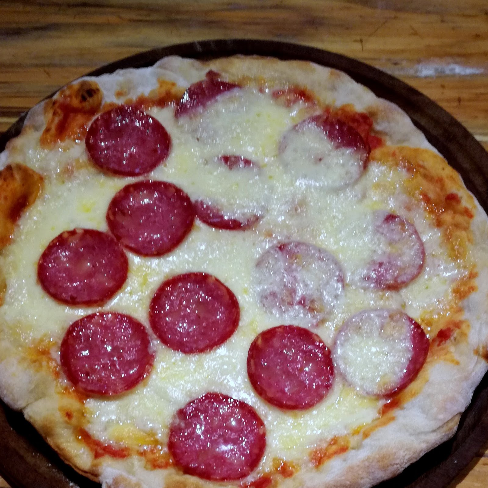10. Ya con los comensales en la mesa y el horno bien caliente, cubrimos la pizza con la muzzarella, distribuimos por encima el salame (o por debajo según prefieran, nosotros hicimos 50% y 50%) y horneamos hasta que el queso comience a gratinar, unos 5′.