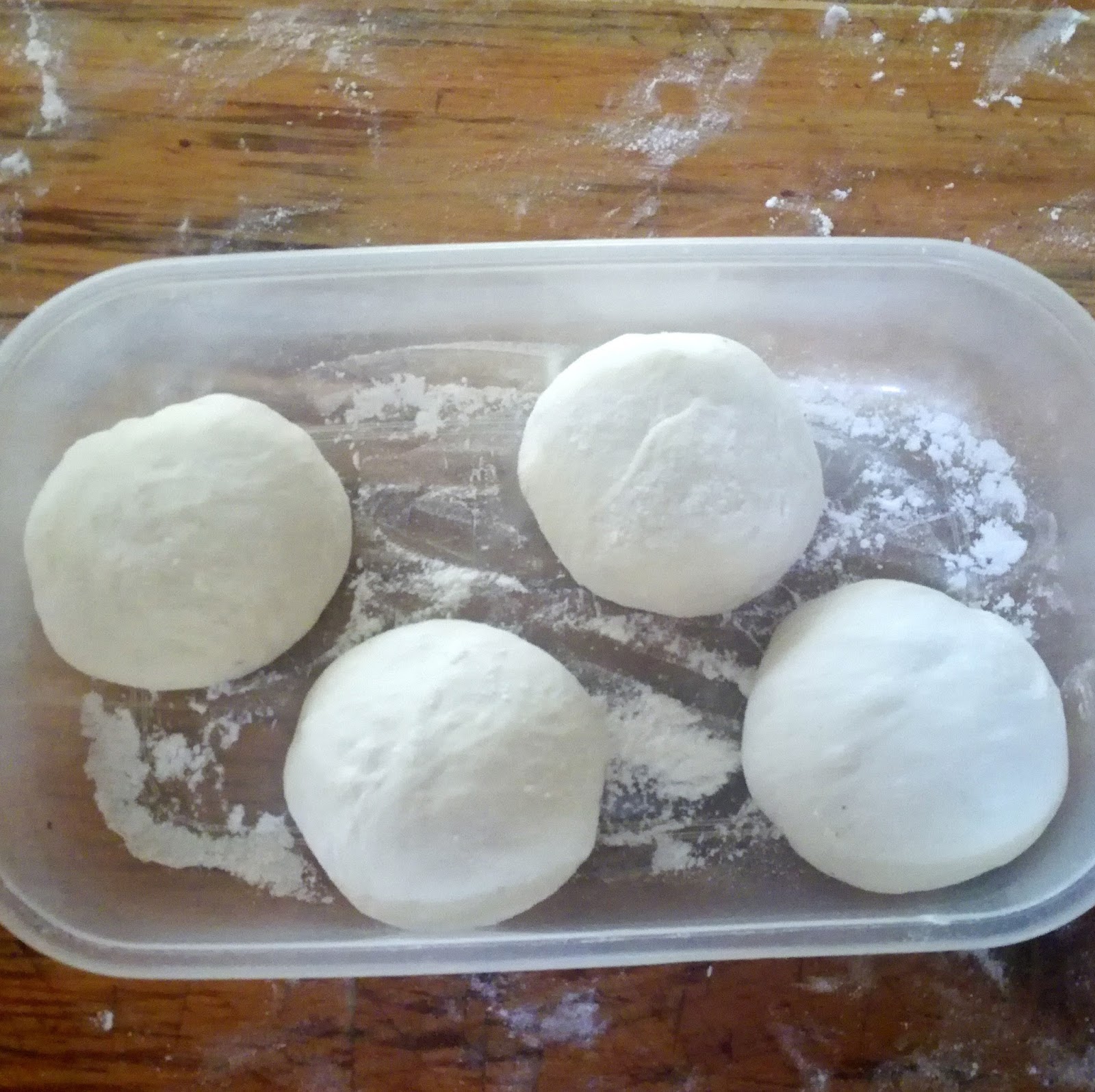4. Volcamos la masa sobre una superficie enharinada y la cortamos en 3 (o hasta 5) partes de peso similar. Las bollamos y colocamos en un plato tupper amplio dejando algún espacio entre cada una; las espolvoreamos con un poco de harina, tapamos y llevamos a frío por 24 a 36 horas.
