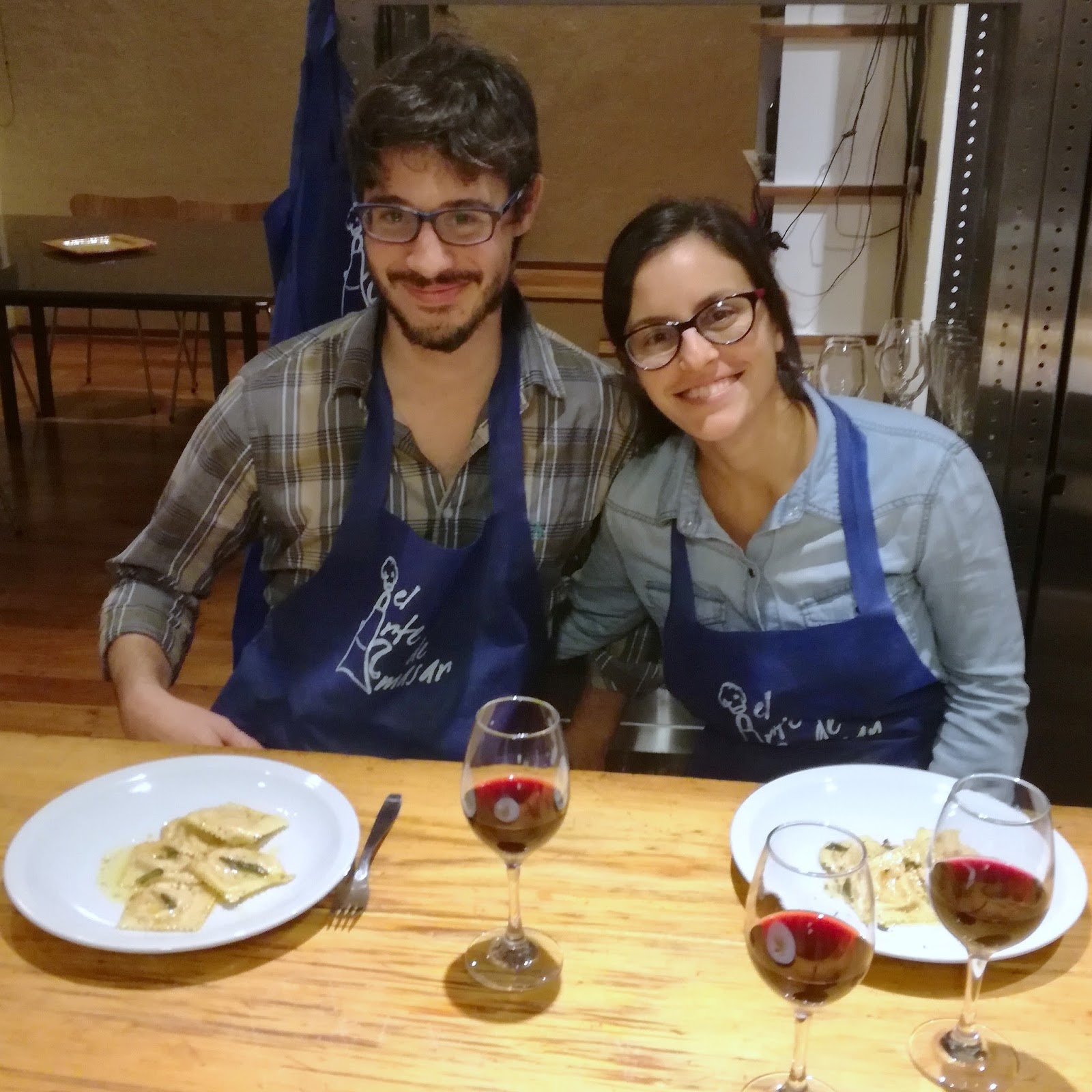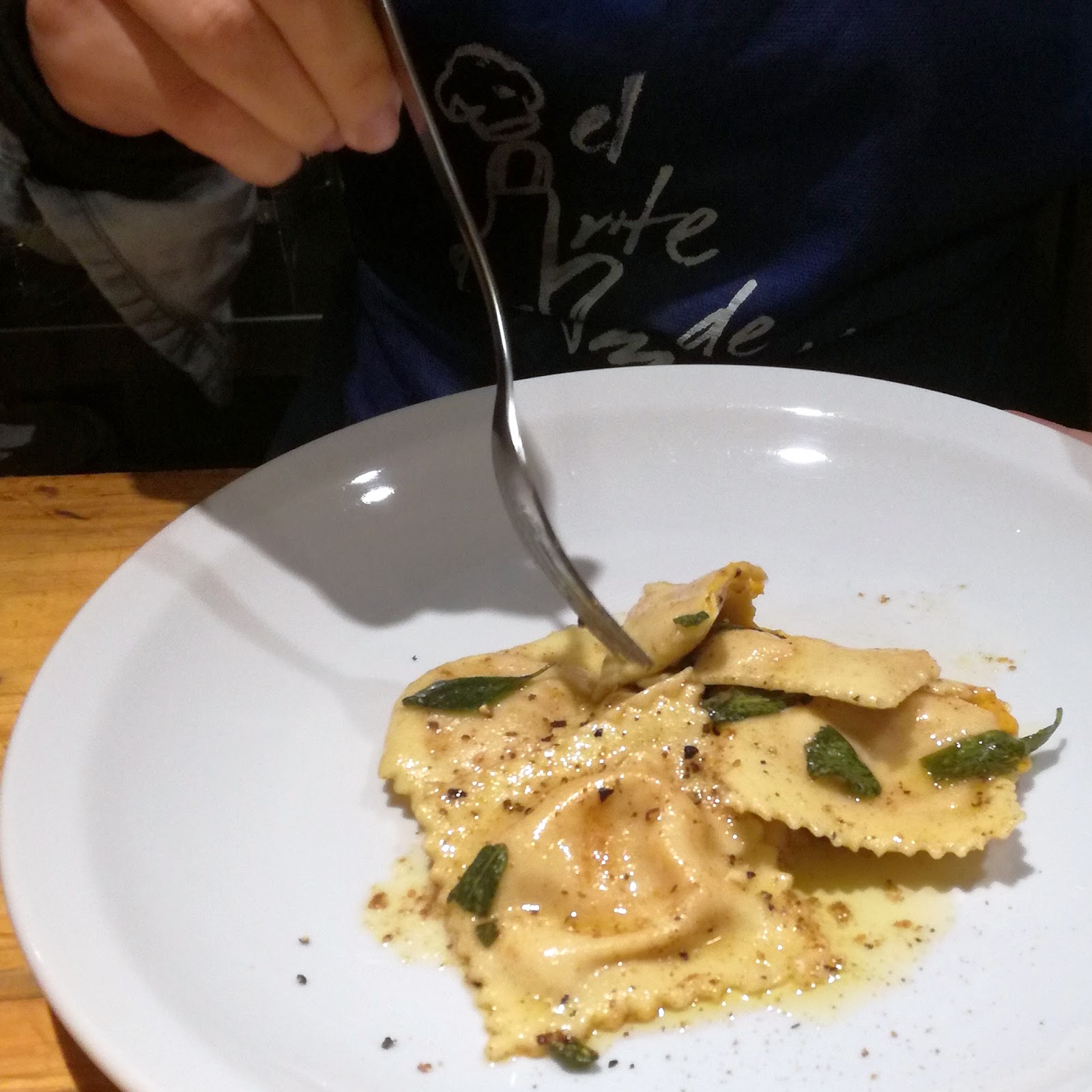 Enharinamos la parte inferior de una tira, la disponemos sobre el molde y con una cucharita vamos colocando el relleno; cubrimos con la otra tira, presionamos suavemente con las manos para quitar el aire y luego pasamos por encima un palo para sellarlos y separarlos. Volcamos sobre la superficie de trabajo y completamos el corte con un cortapastas. Los reservamos sobre superficie enharinada. Repetimos con las otras tiras y recuperamos los restos de masa.