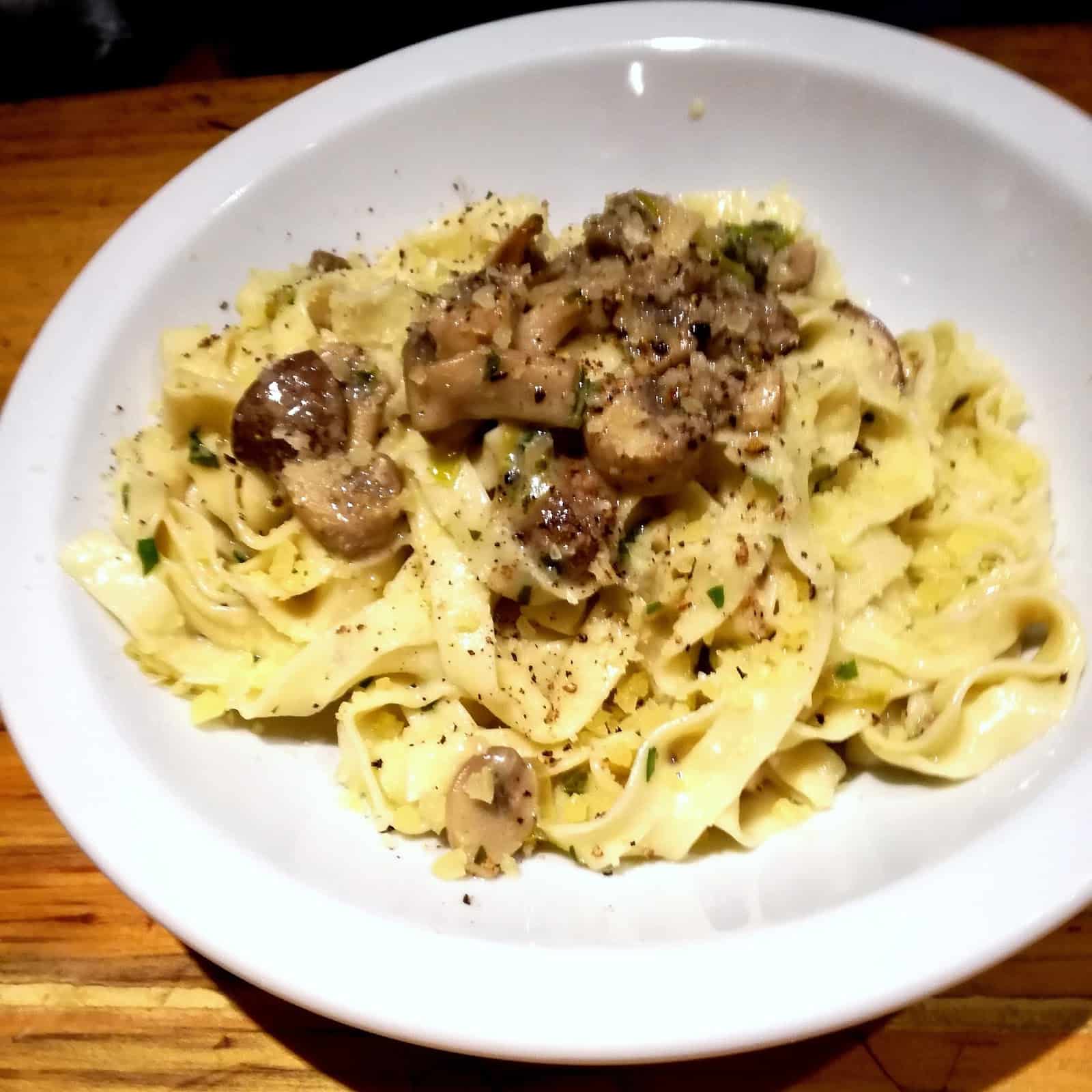 FETUCCINI CON SALSA DE PORTOBELOS, CHAMPIÑONES Y PUERRO