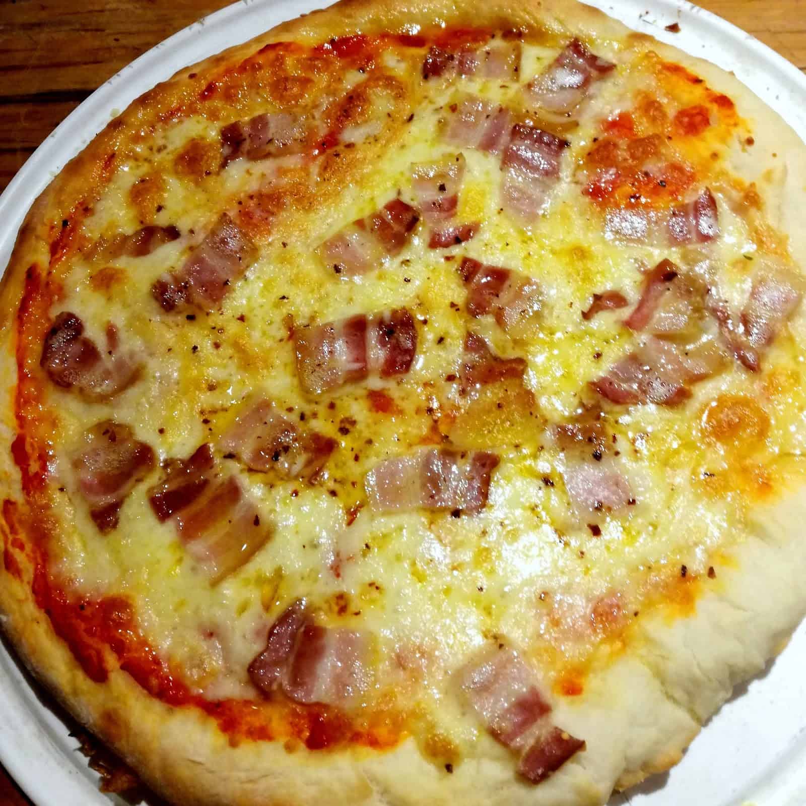 Distribuimos por encima la muzzarella, luego la panceta y por último el parmesano. Horneamos en horno bien caliente y a temperatura máxima hasta que el queso haya gratinado y la base comenzado a dorarse, unos 15′. (También podemos “marcar”unos minutos las pizzas con sólo la salsa de tomates de modo de estar más cómodos a la hora de la comida).