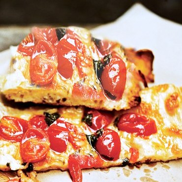 PIZZA ESTILO ROMANO DE TOMATES CHERRY ROSTIZADOS, MUZZARELLA Y PARMESANO