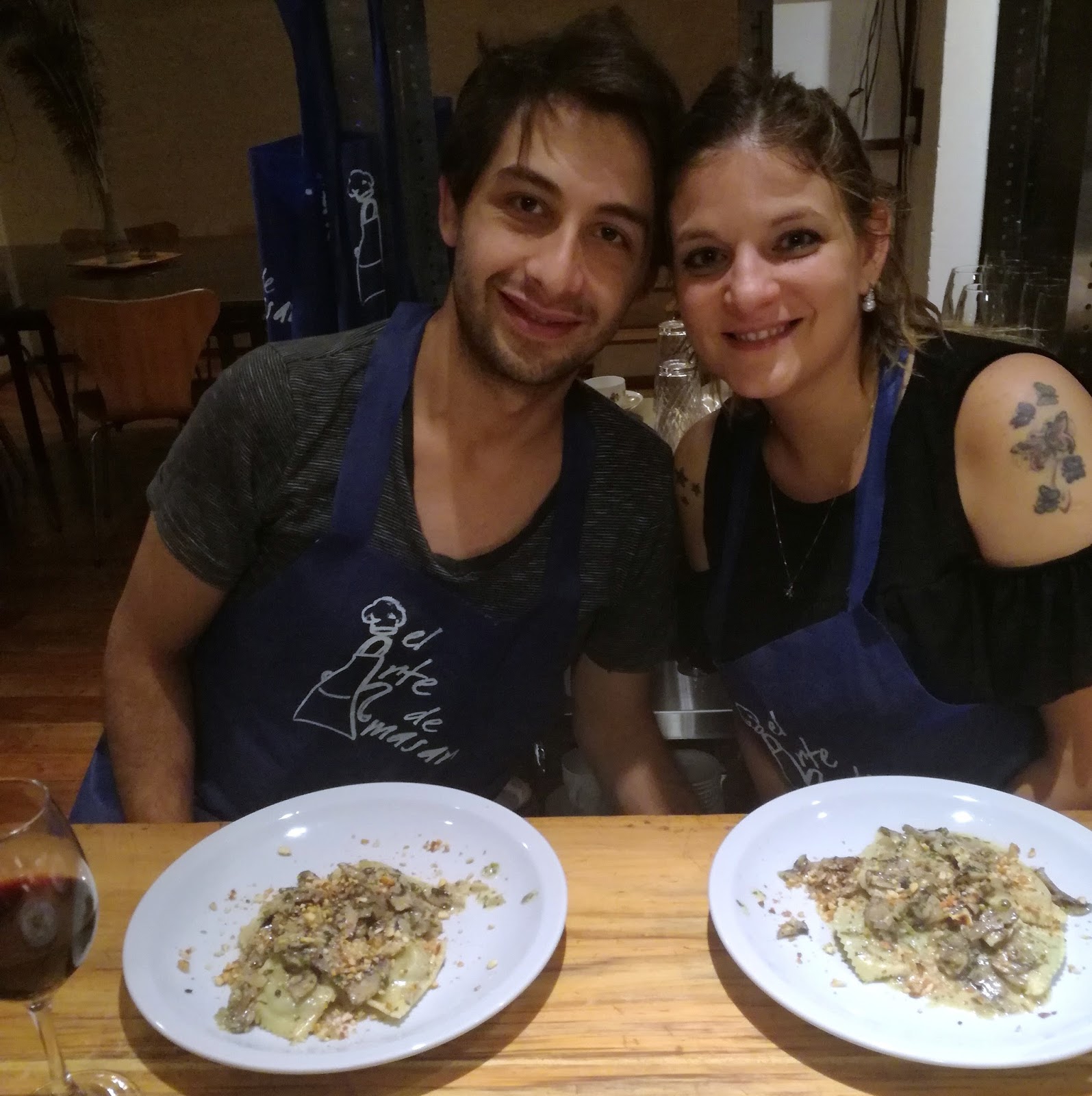 Colocamos una tira previamente enharinada en su base sobre el molde y con una cucharita vamos poniendo el relleno; cubrimos con la otra tira, presionamos suavemente para quitar el aire y hacemos rodar un palo por encima de modo de marcar y sellar. Volcamos sobre la superficie de trabajo y completamos el corte con un corta pastas si hiciera falta; reservamos sobre superficie enharinada.