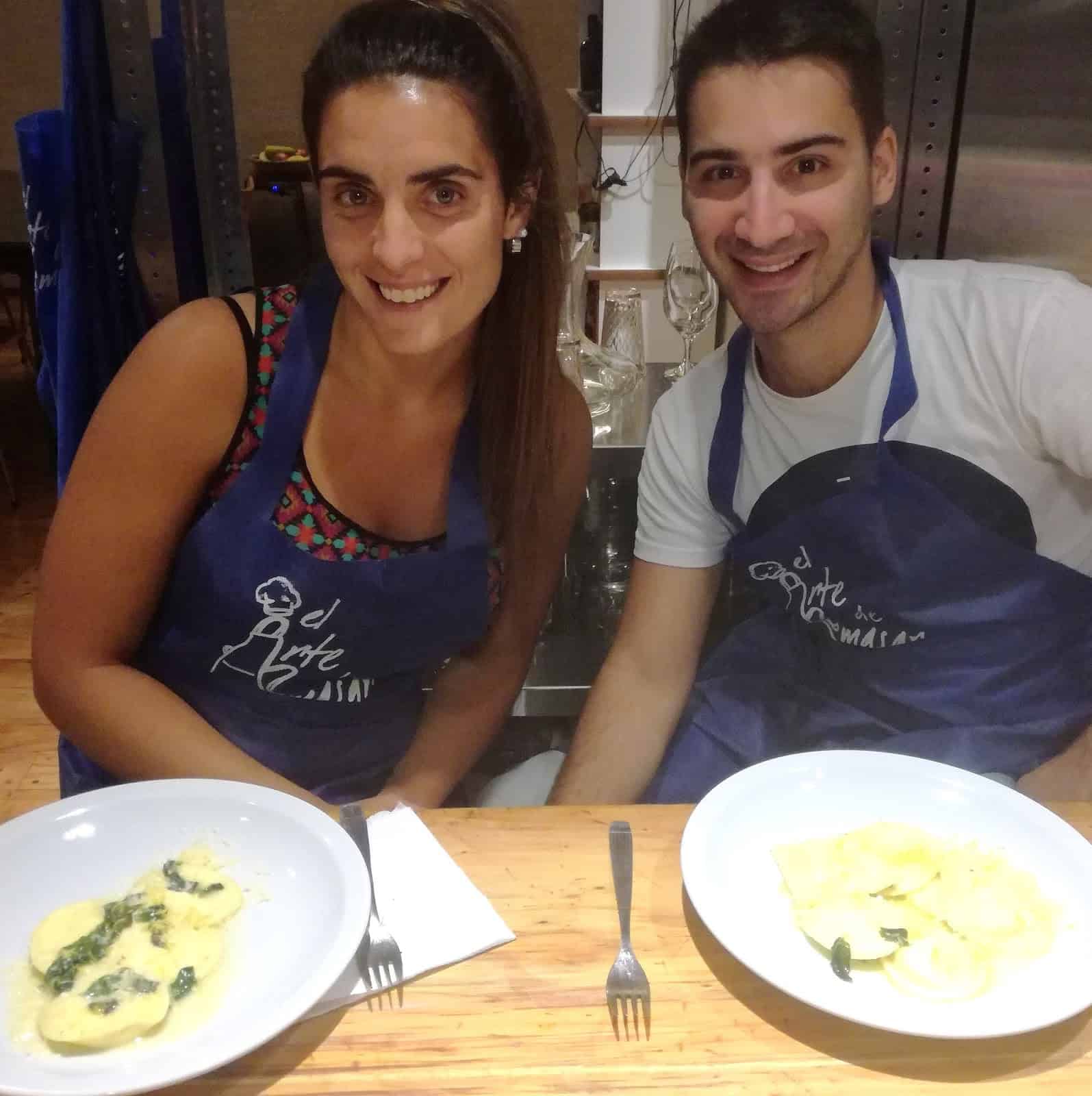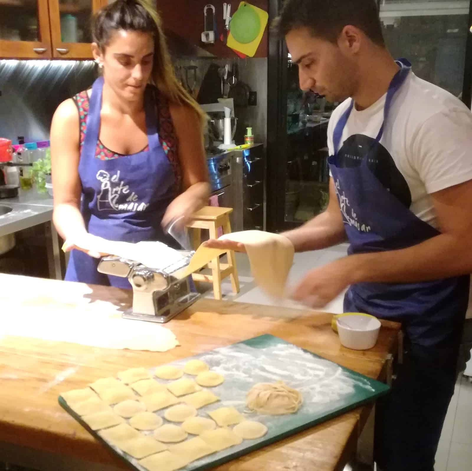Estiramos la masa hasta el punto 6 ó 7, según la máquina, y dividimos en tiras de tamaño algo mayor que el molde raviolero. Colocamos una tira previamente enharinada en su base sobre el molde y con una cucharita vamos poniendo el relleno; cubrimos con la otra tira, presionamos suavemente para quitar el aire y hacemos rodar un palo por encima de modo de marcar y sellar. Volcamos sobre la superficie de trabajo y completamos el corte con un corta pastas; reservamos sobre superficie enharinada. Repetimos con las otras tiras, recuperando los sobrantes de masa.
